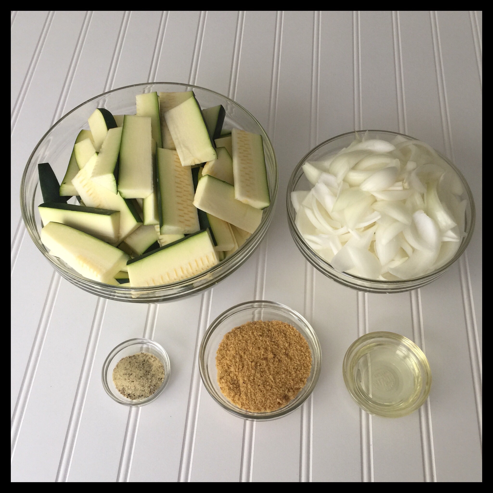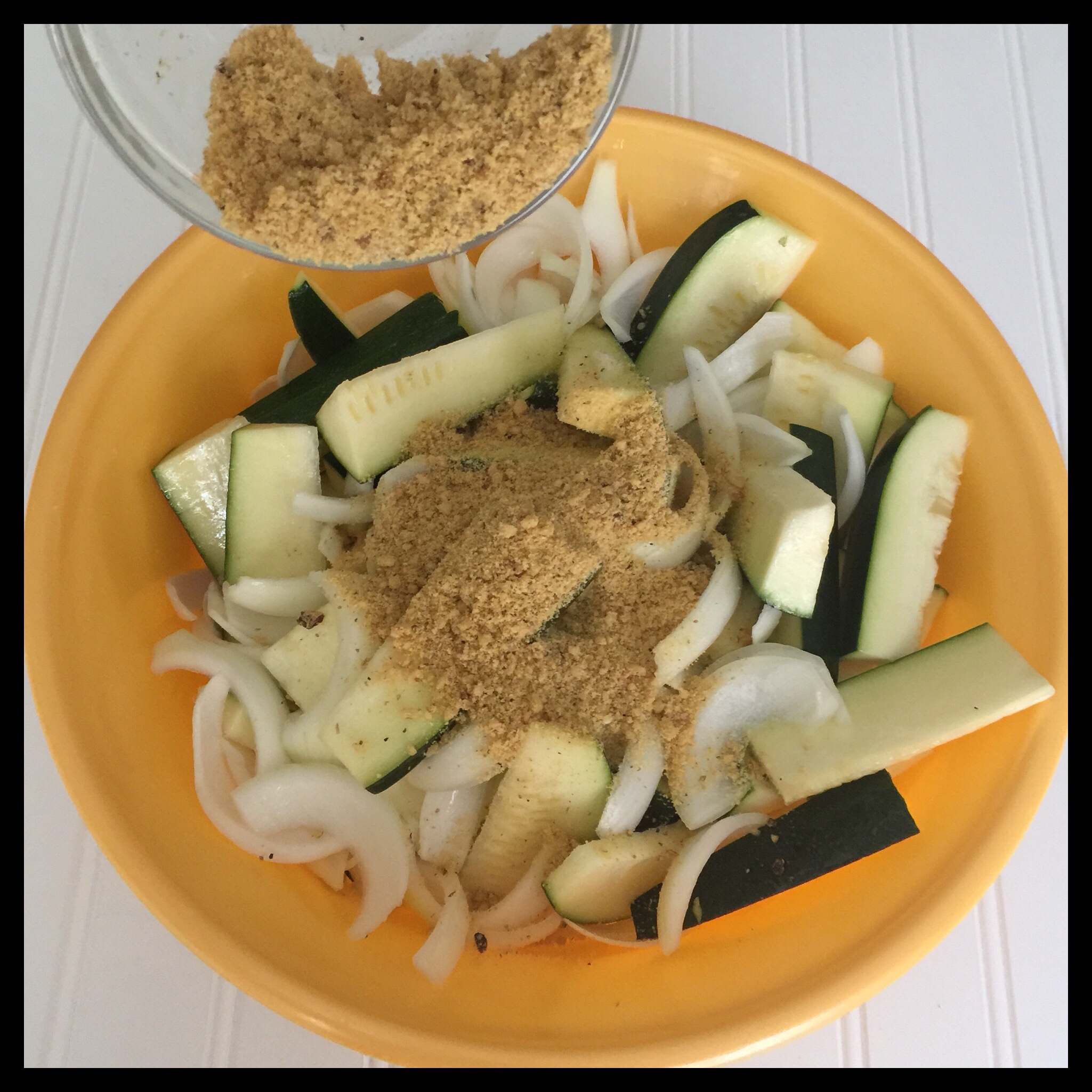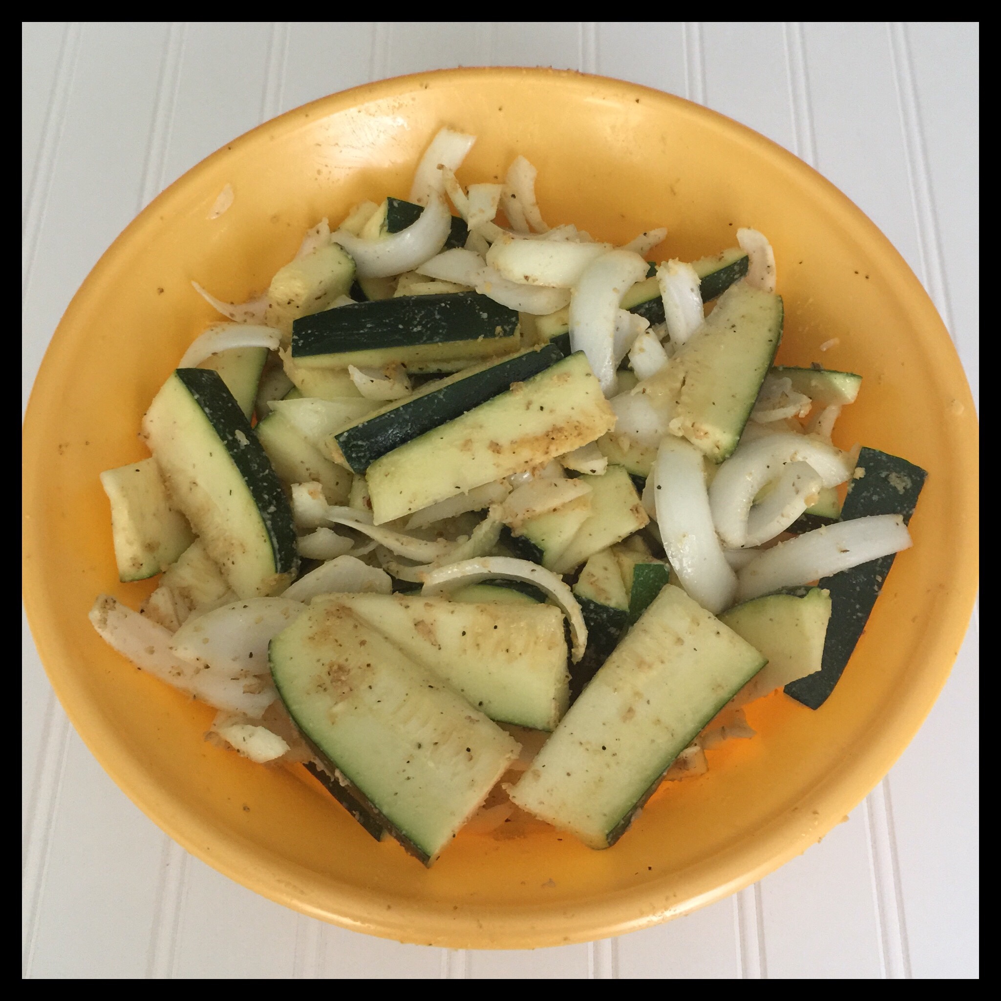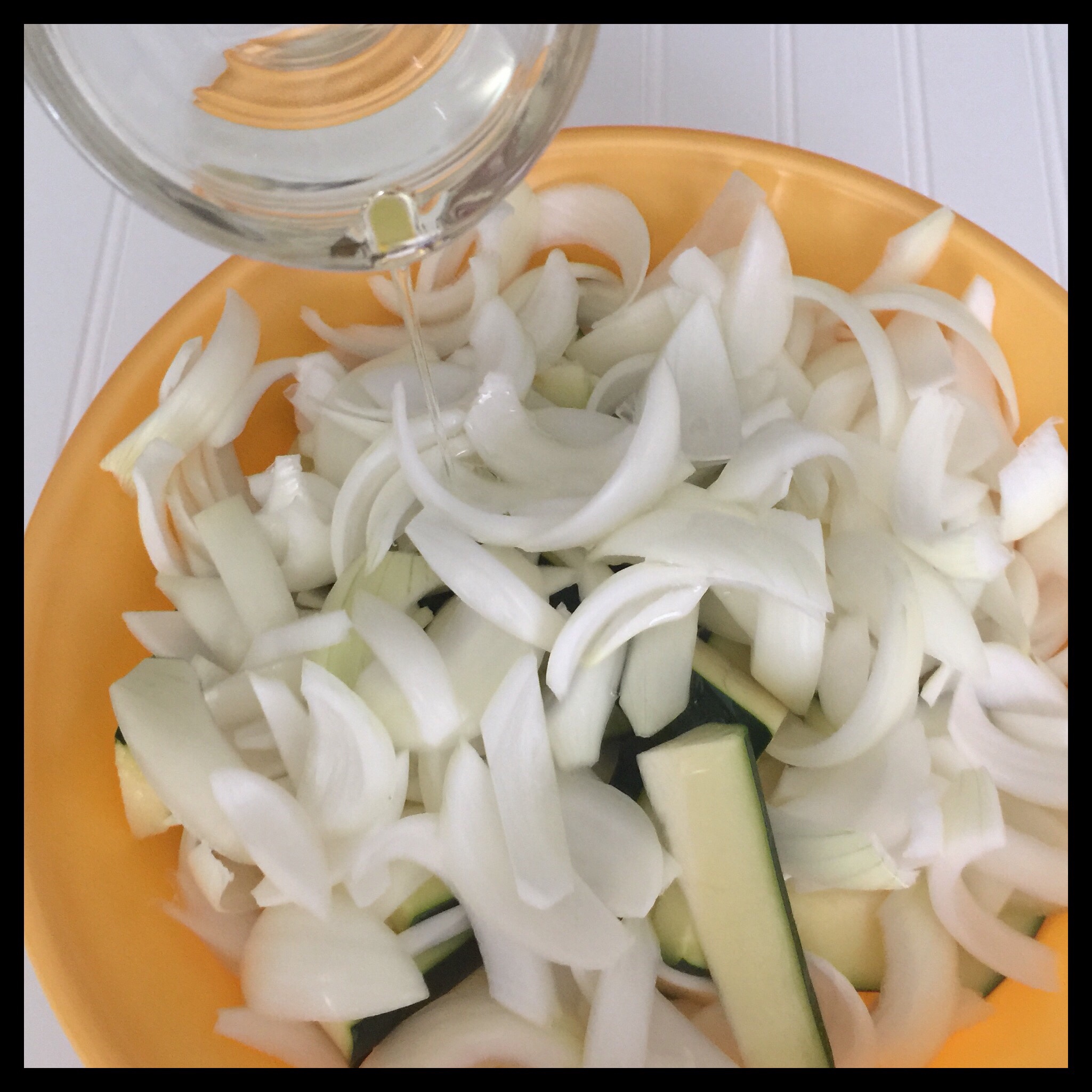 Cut your zucchini into pieces that are about three inches long and half an inch wide. Cut your onions into half-inch wide strips. Add both to a large mixing bowl and toss with the oil to coat all of the pieces.