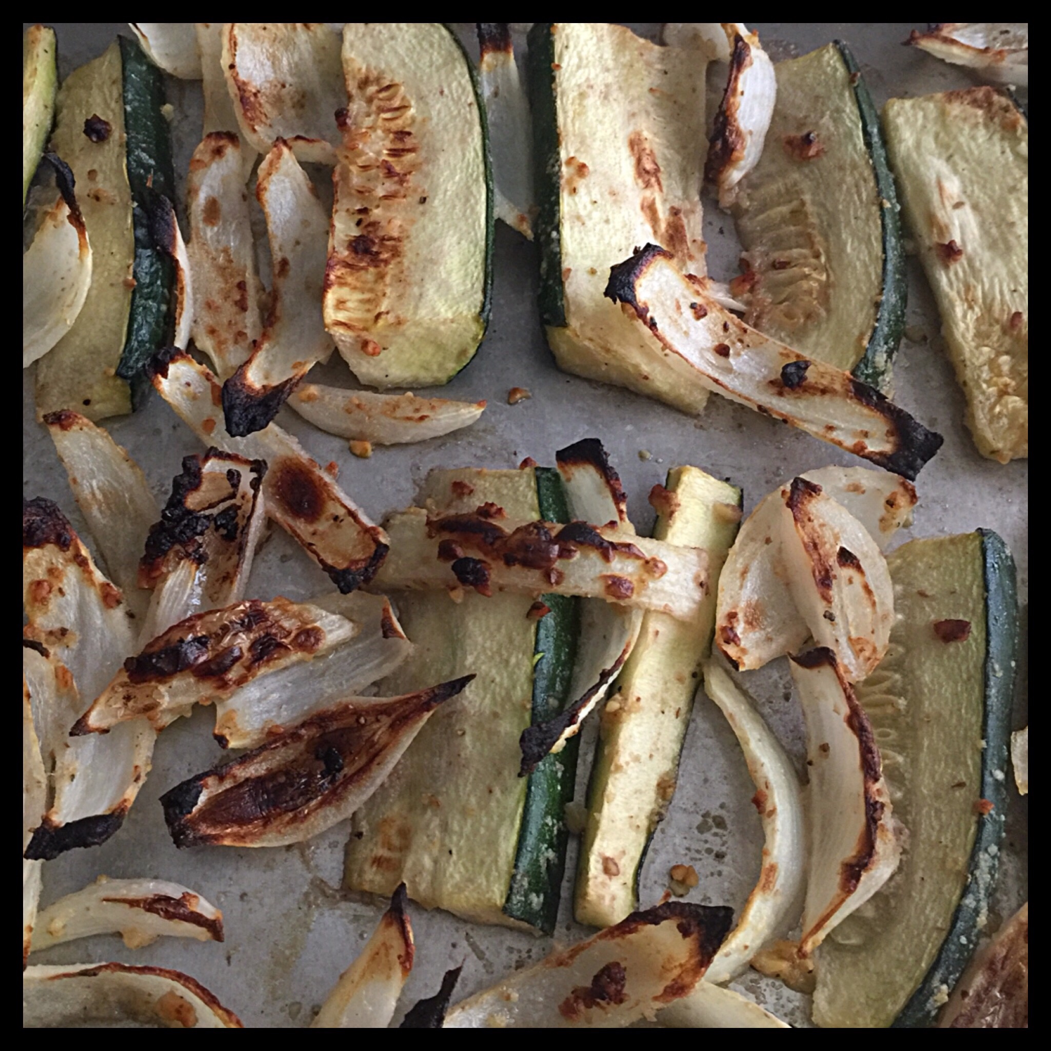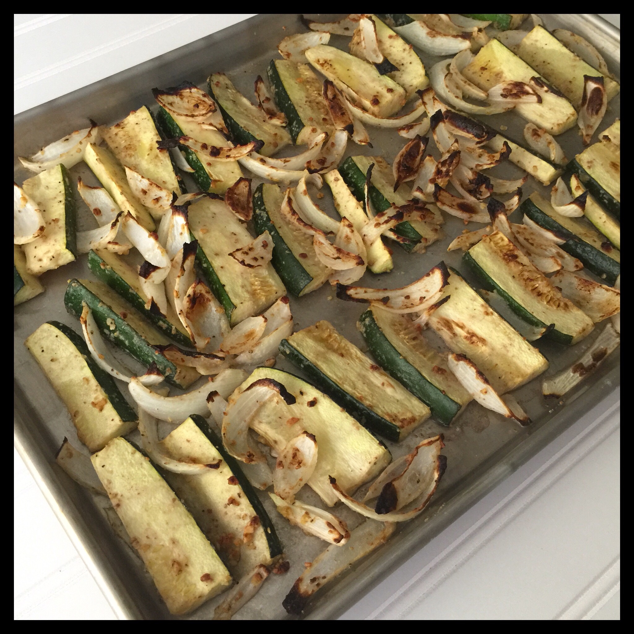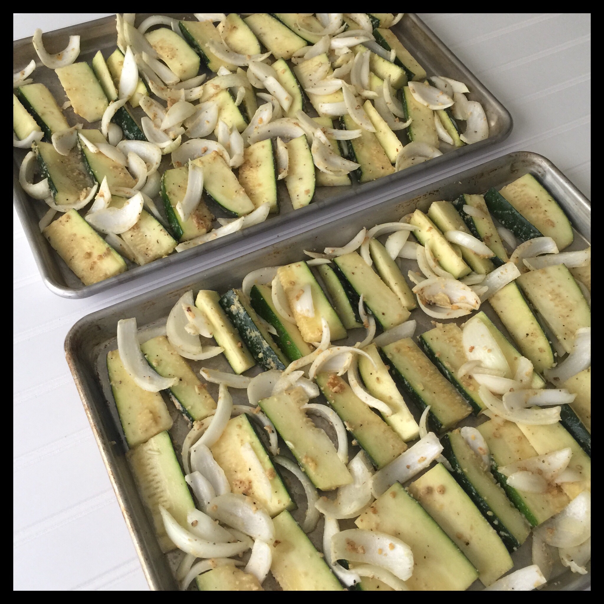 Spray two half-sheet pans with non-stick spray, then spread the zucchini and onions out in a single layer on the pans: