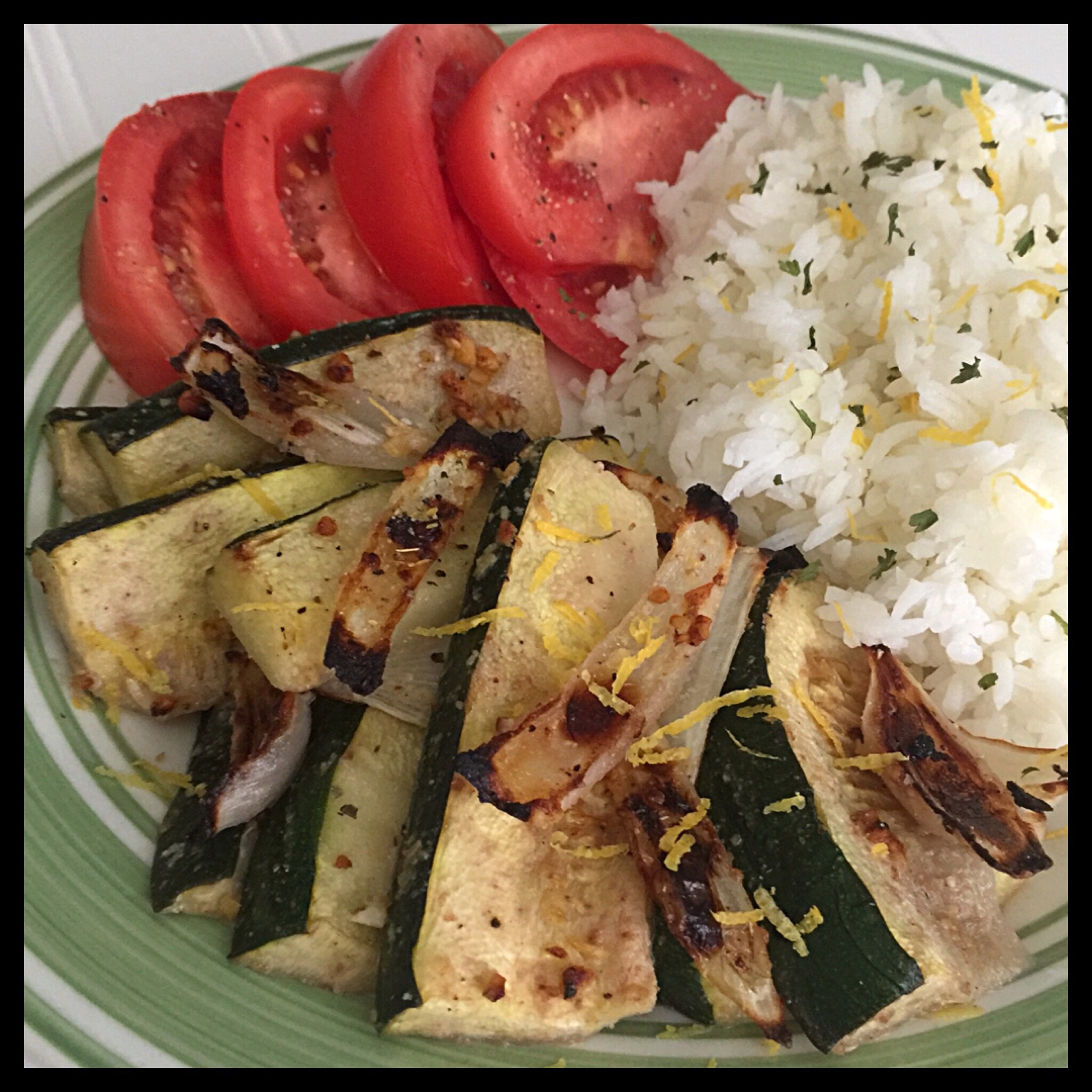 Taste and sprinkle with additional lemon pepper and/or vegan parmesan if needed. Garnish with lemon zest and serve as desired. I added chopped parsley and lemon zest to cooked white rice and served it with sliced tomatoes and the roasted vegetables:
