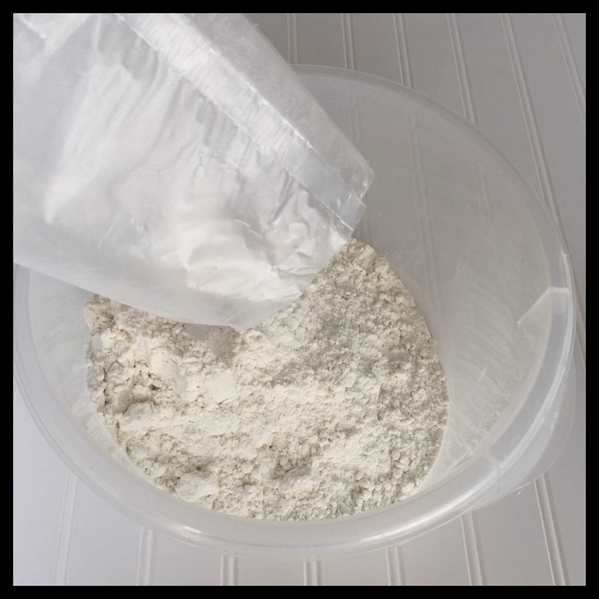 To make my two-ingredient flour, all you need is two 32 oz boxes of the Vitacost blend (64 oz total) and one bag of The Plant Based Egg! You’ll also need a large container and a scoop or large spoon: