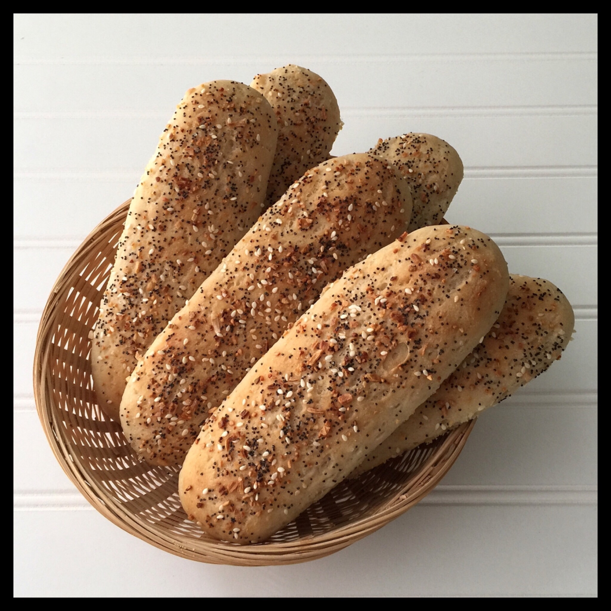 Here, I used my sandwich roll recipe, but shaped the dough into six mini French rolls and added Trader Joe’s Everything but the Bagel seasoning:
