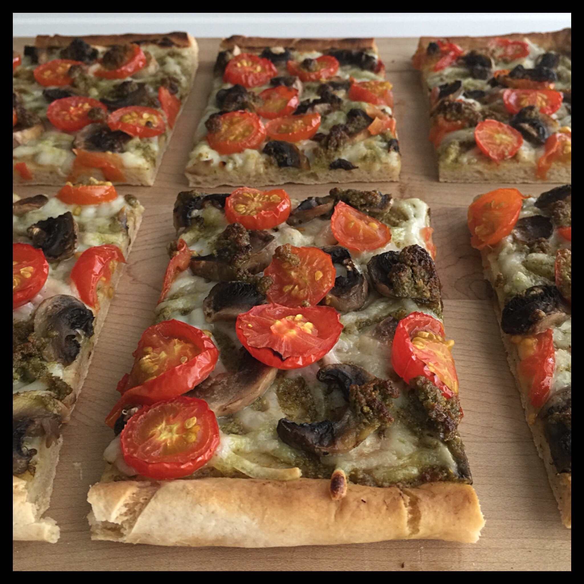 I made a pesto pizza and this flour makes a wonderful pizza crust that is crunchy on the edges and soft and fluffy on the inside: