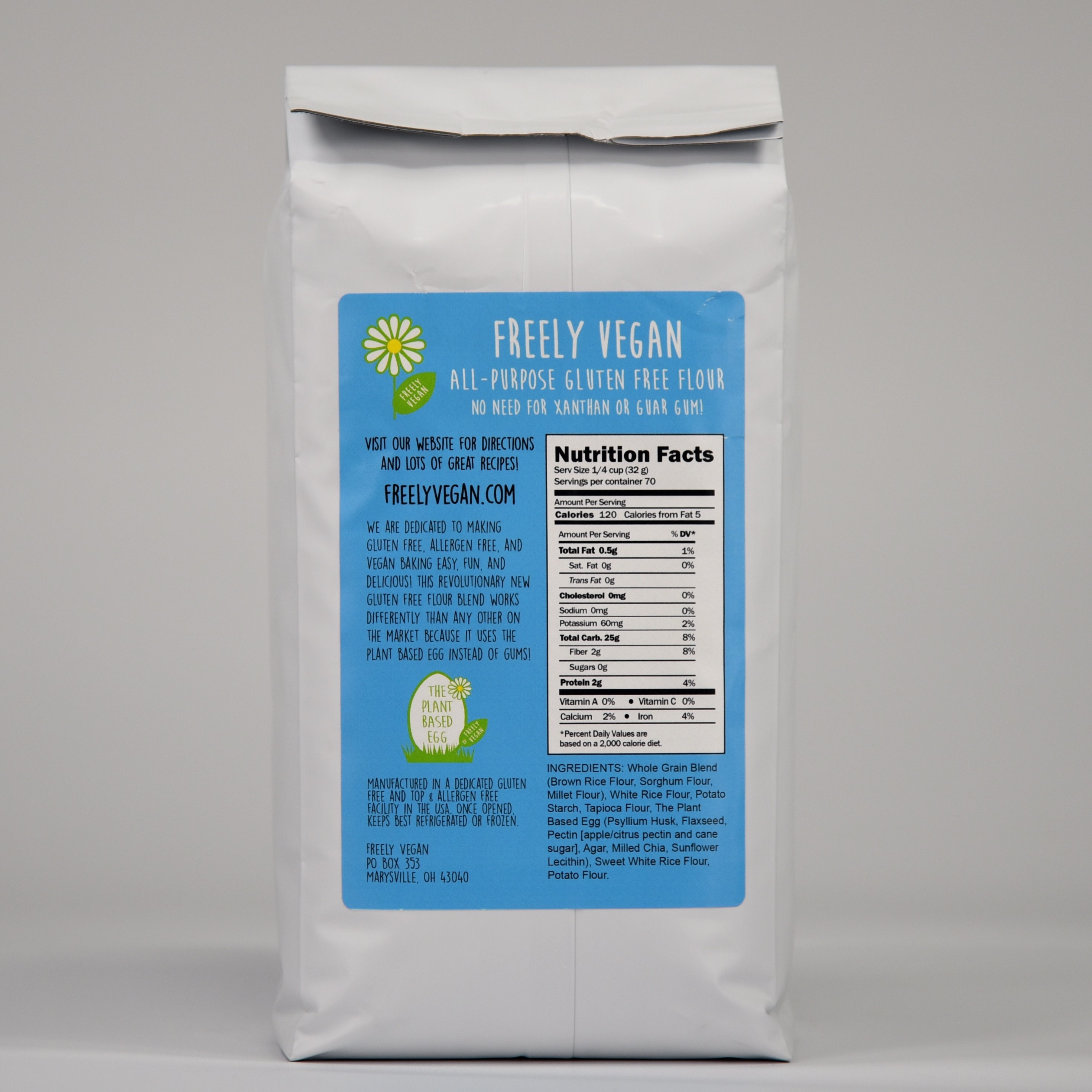Newest Flour Blend Info! I am so excited to announce that Freely Vegan Gluten Free All-Purpose Flour is now available! It already has The Plant Based Egg built in and it works even better than the two-ingredient blend below. I developed it to work perfectly in all of my recipes and it went through thousands of hours of testing. Each ingredient was tested to the perfect level and was sourced from the best mill. Freely Vegan Gluten Free All-Purpose Flour is ready to use in all of my recipes right out of the bag!