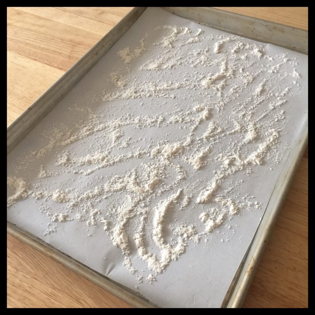 Line a half-sheet pan with parchment, then sprinkle the paper with a generous amount of flour like this: