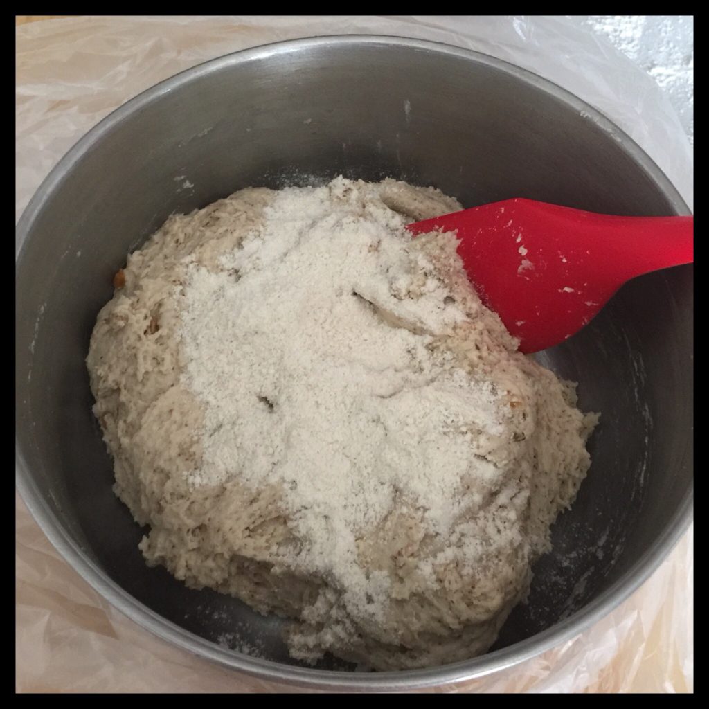 When you have added enough flour, the dough will not stick to the bowl anymore, and you will be able to shape a soft rope of dough in your lightly-oiled hands (gloves make this much easier!)