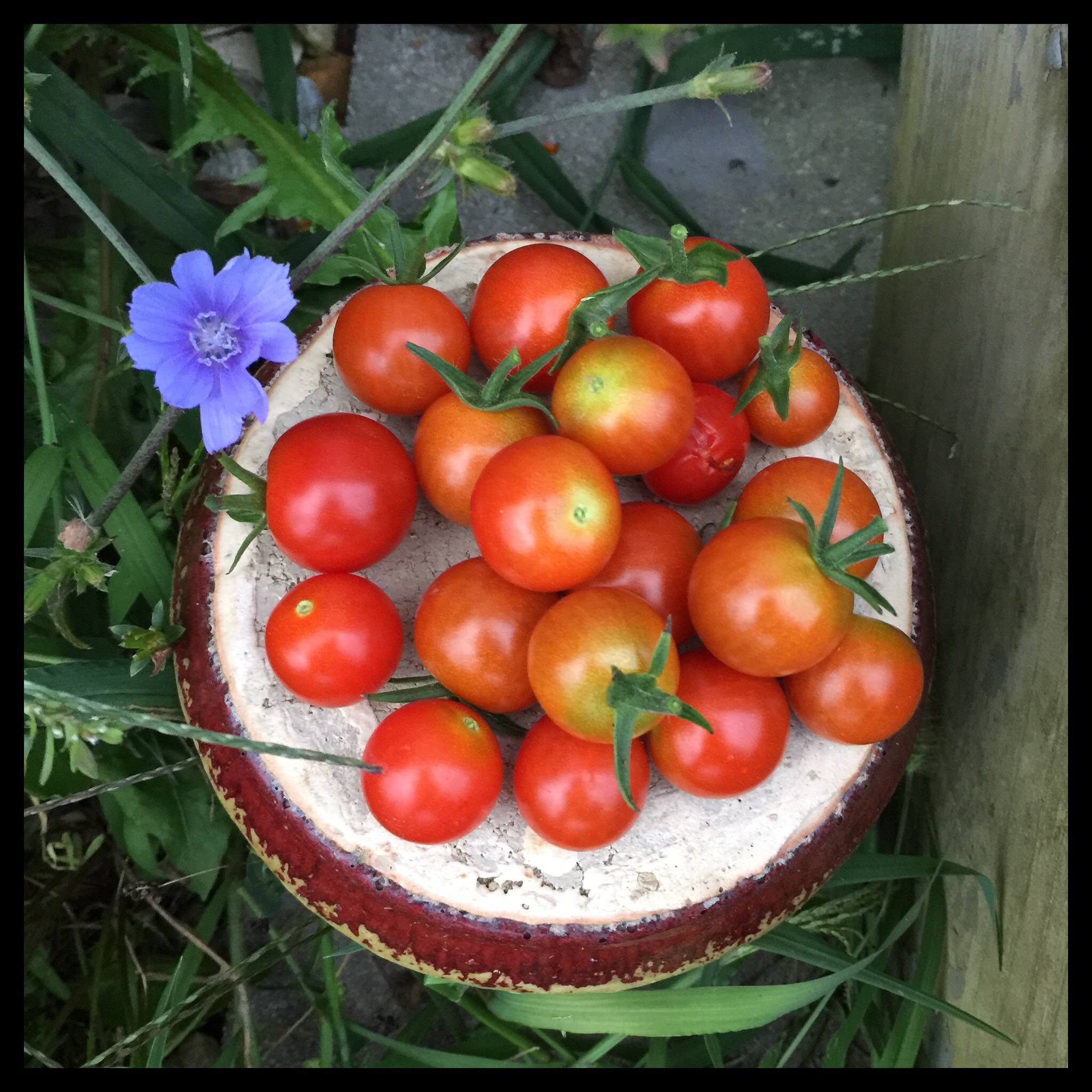 We checked our little garden when we got back. Some of the cherry tomatoes were ripe, so we picked those to eat with dinner.