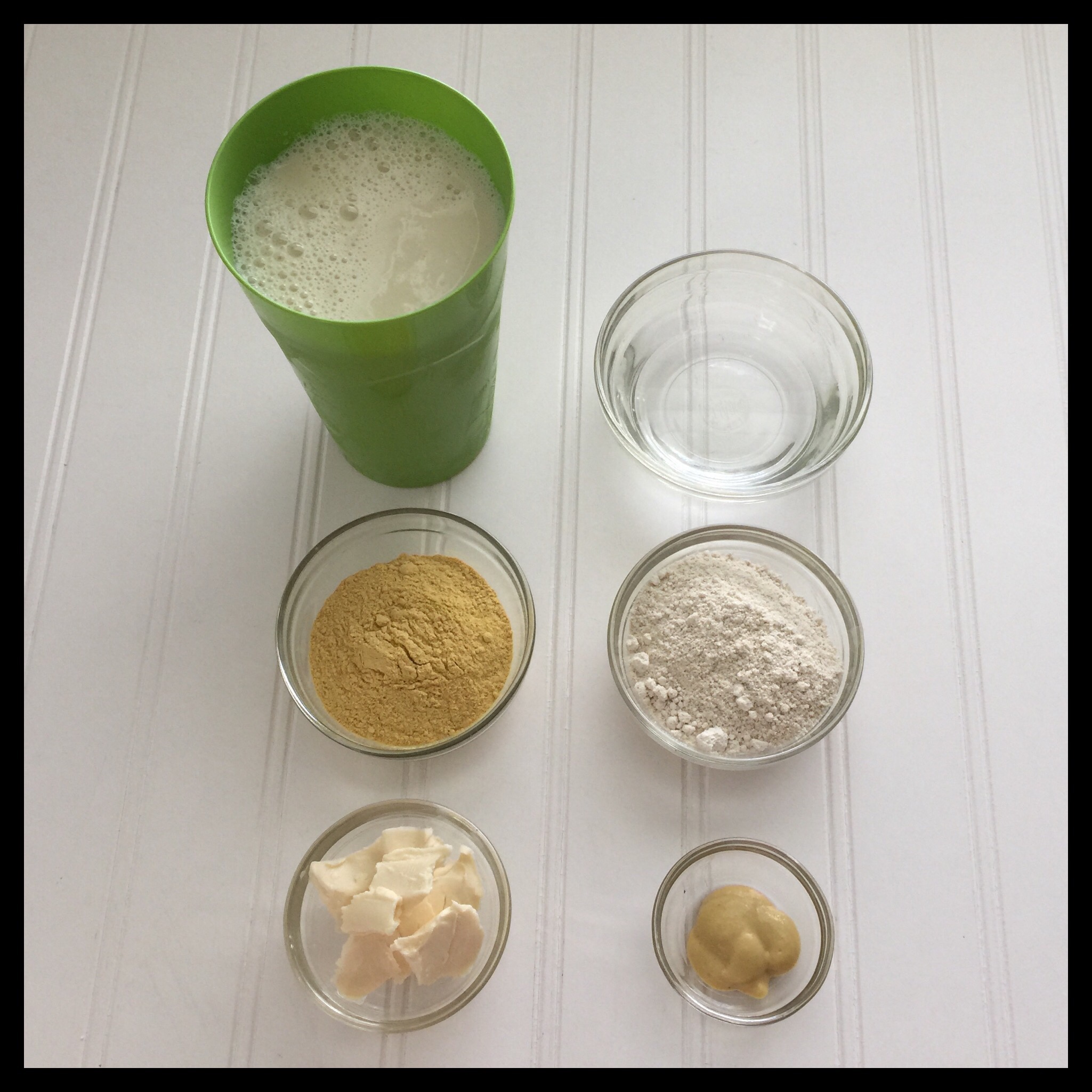 The Earth Balance, oat (or all-purpose) flour, and unsweetened soy (or other plant) milk are used to make a white sauce. Then, the complex cheesy flavor is created by combining So Cheezy vegan cheese seasoning, Dijon mustard, and miso paste with a little water. (You can order So Cheezy seasoning from either Freely Vegan or Amazon.)