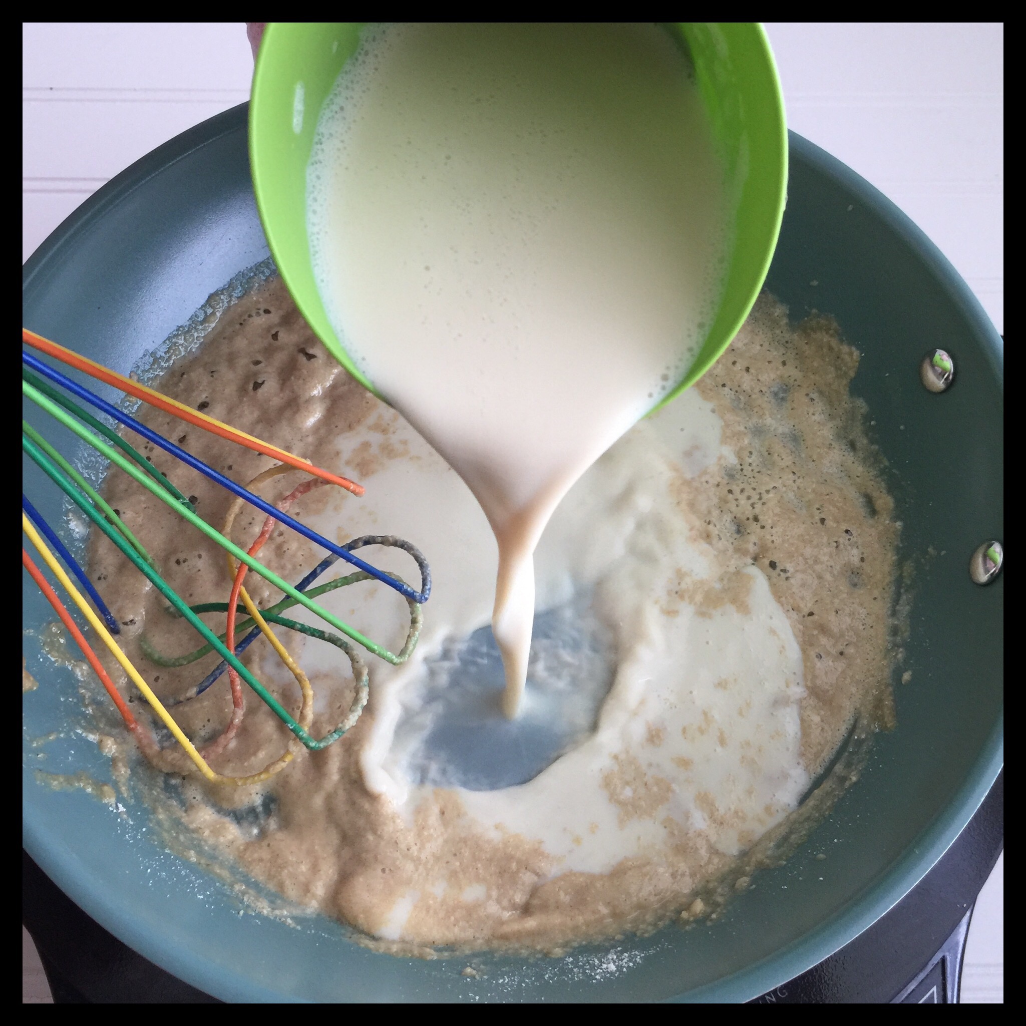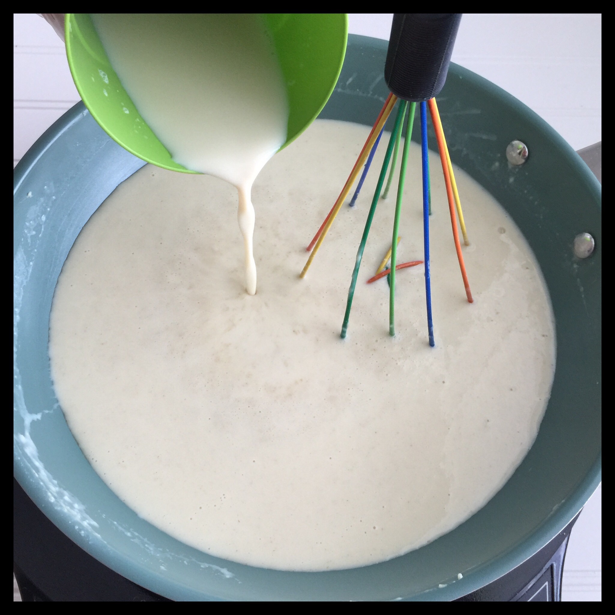 Once the sauce is smooth and creamy like this, whisk in the rest of the milk: