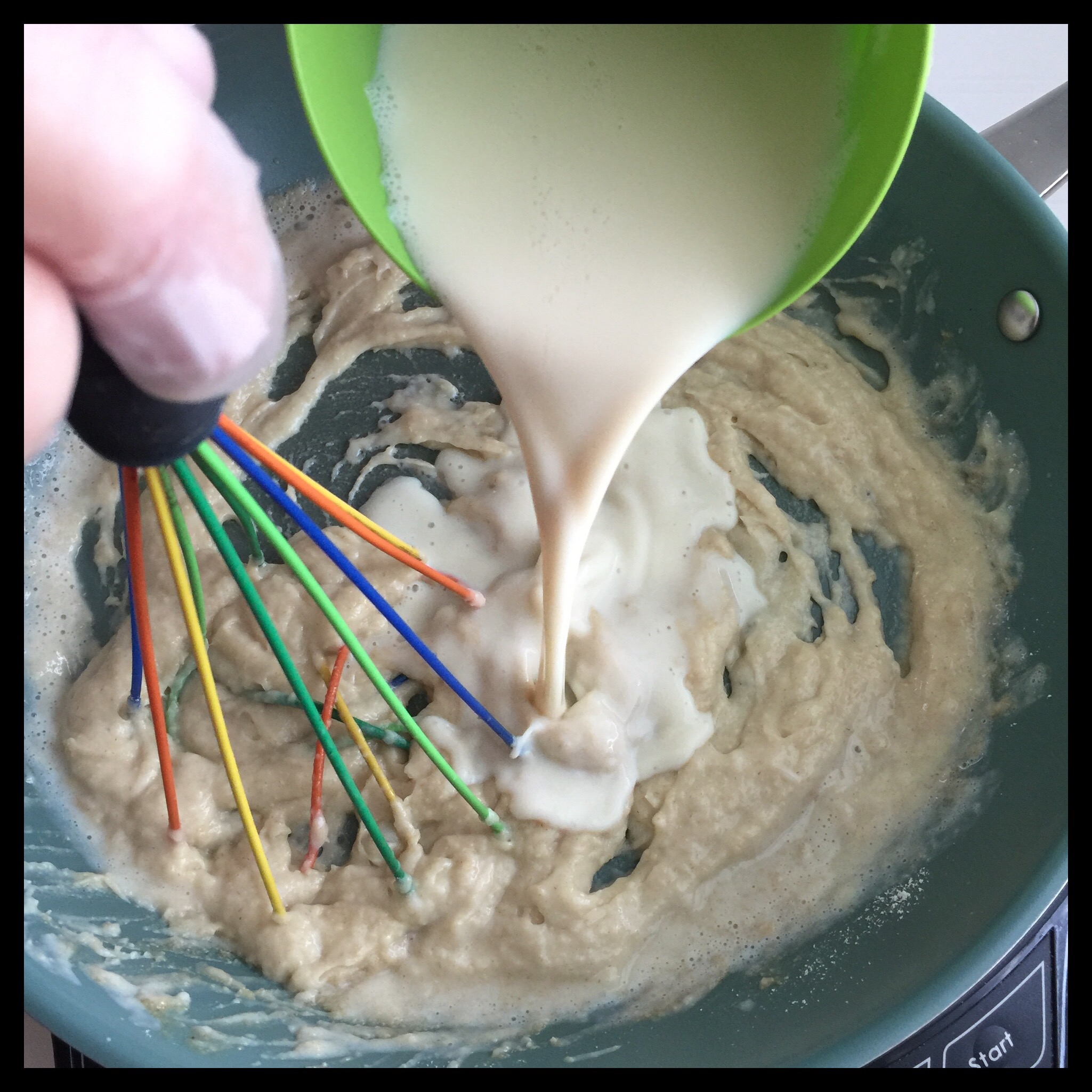 Gradually add the unsweetened soy milk while whisking continuously: