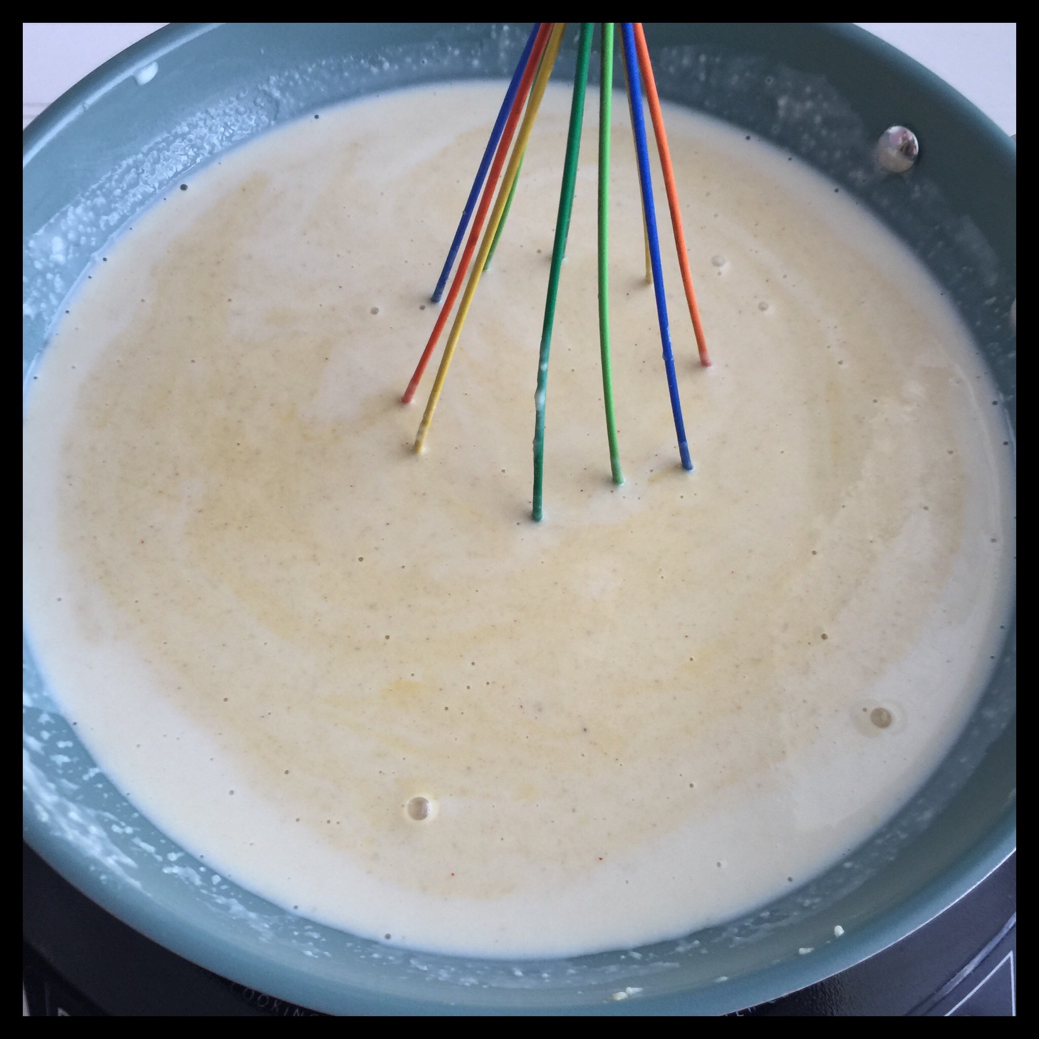 Once the sauce is smooth and creamy like this, whisk in the rest of the milk: