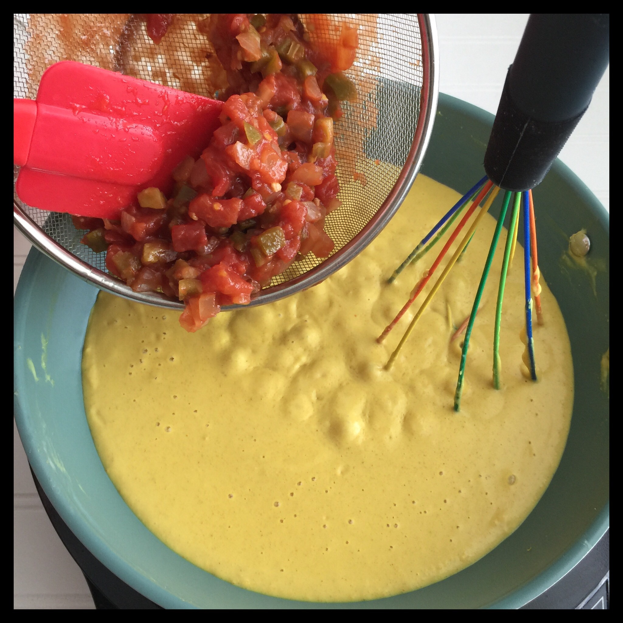 You will need to strain the liquid out of the salsa before adding it to the cheeze sauce, so get that started now: