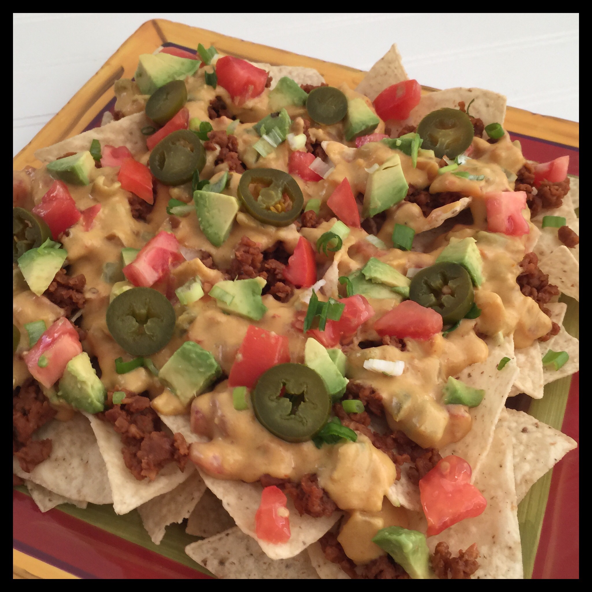 Or, be a bit fancier and make some nachos! I used Gardein Beefless Ground and seasoned it with taco seasoning. I put a bunch of chips on a plate, added the seasoned taco “meat”, then I topped it with the queso, avocado, tomato, green onion, and pickled jalapeños. So good!