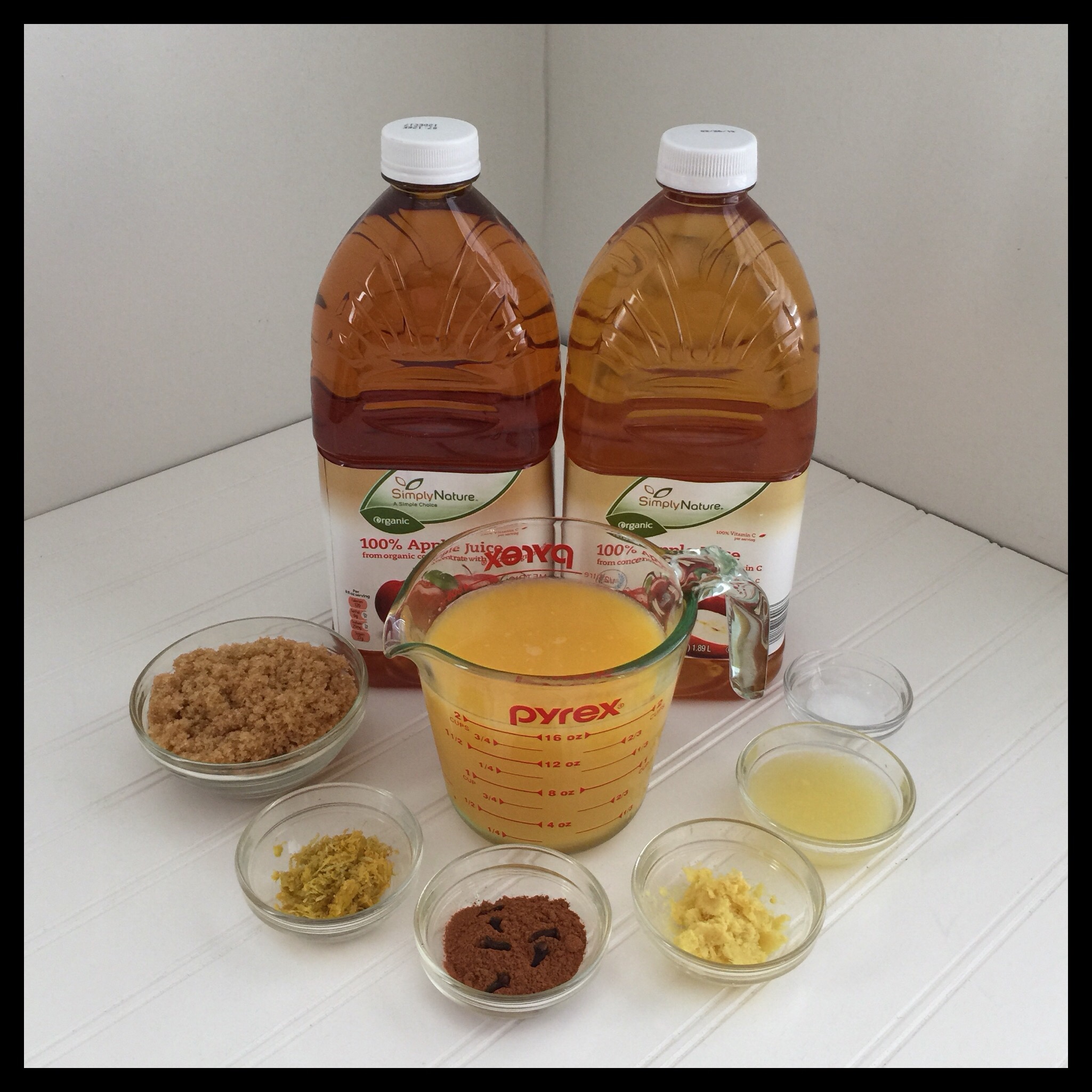 (You will also need two cinnamon sticks, but I forgot to add them to the photo.) You can use apple juice or cider. I really like Aldi’s organic apple juice and you can’t beat their prices.