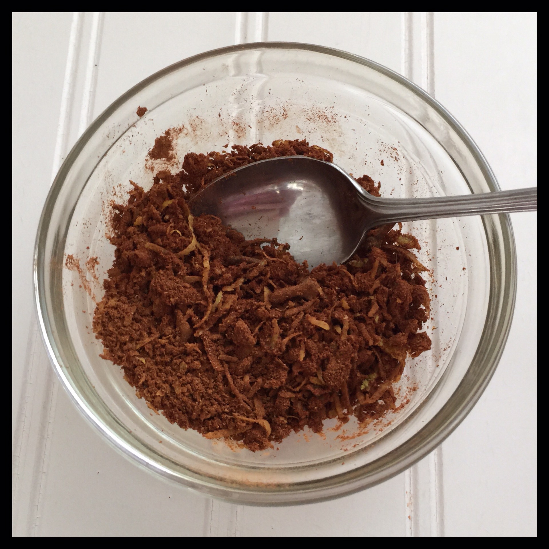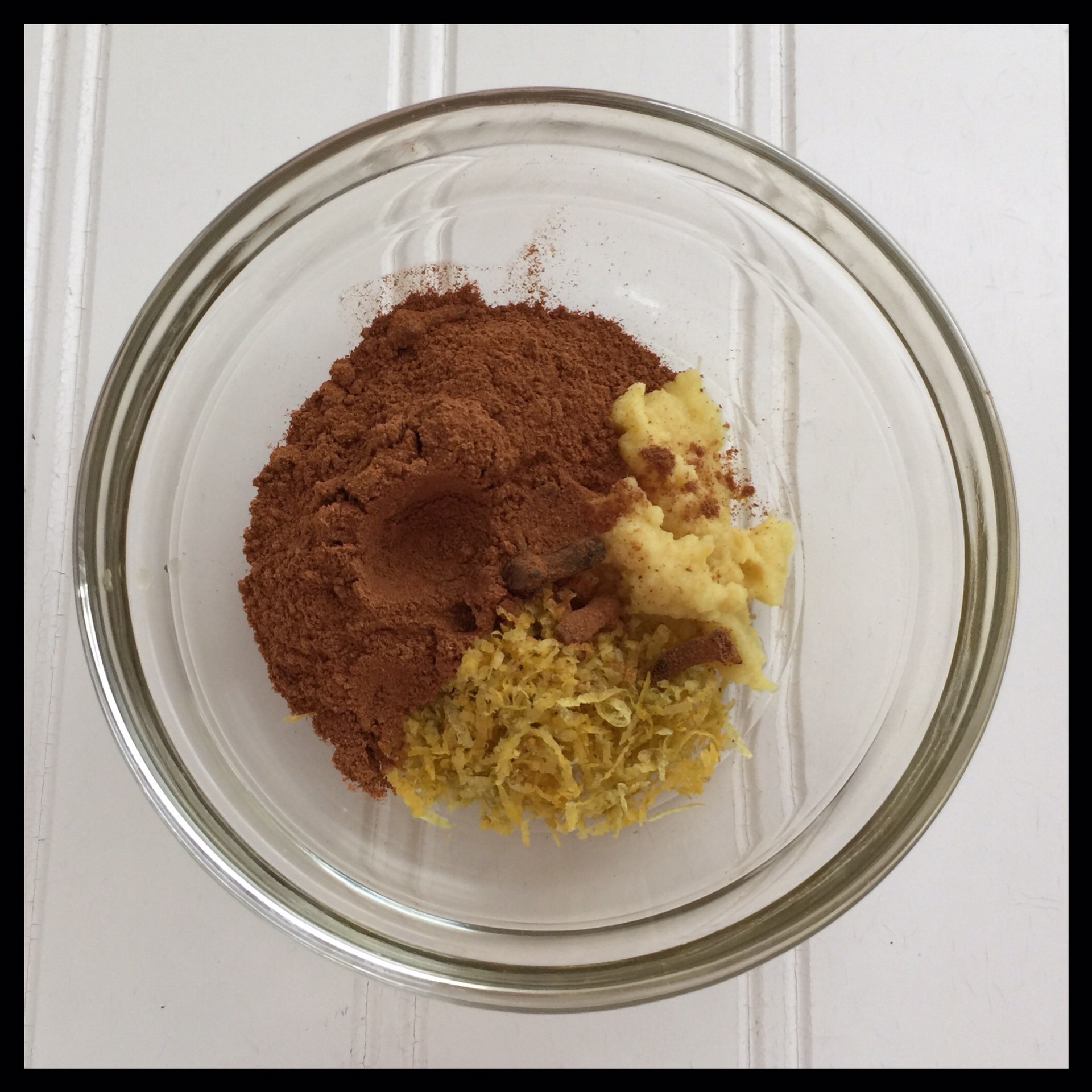 Combine the apple pie spice, grated ginger, lemon zest, and whole cloves in a bowl and mix them together. Doing this helps to keep the apple pie spice in the bag or cheesecloth:
