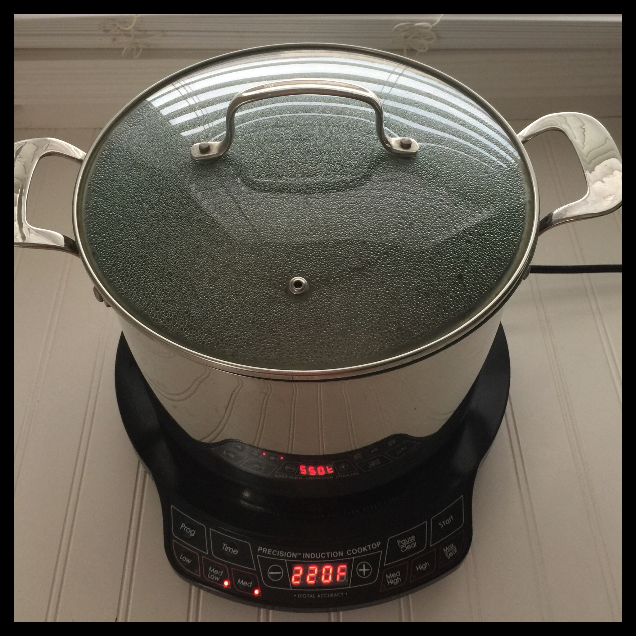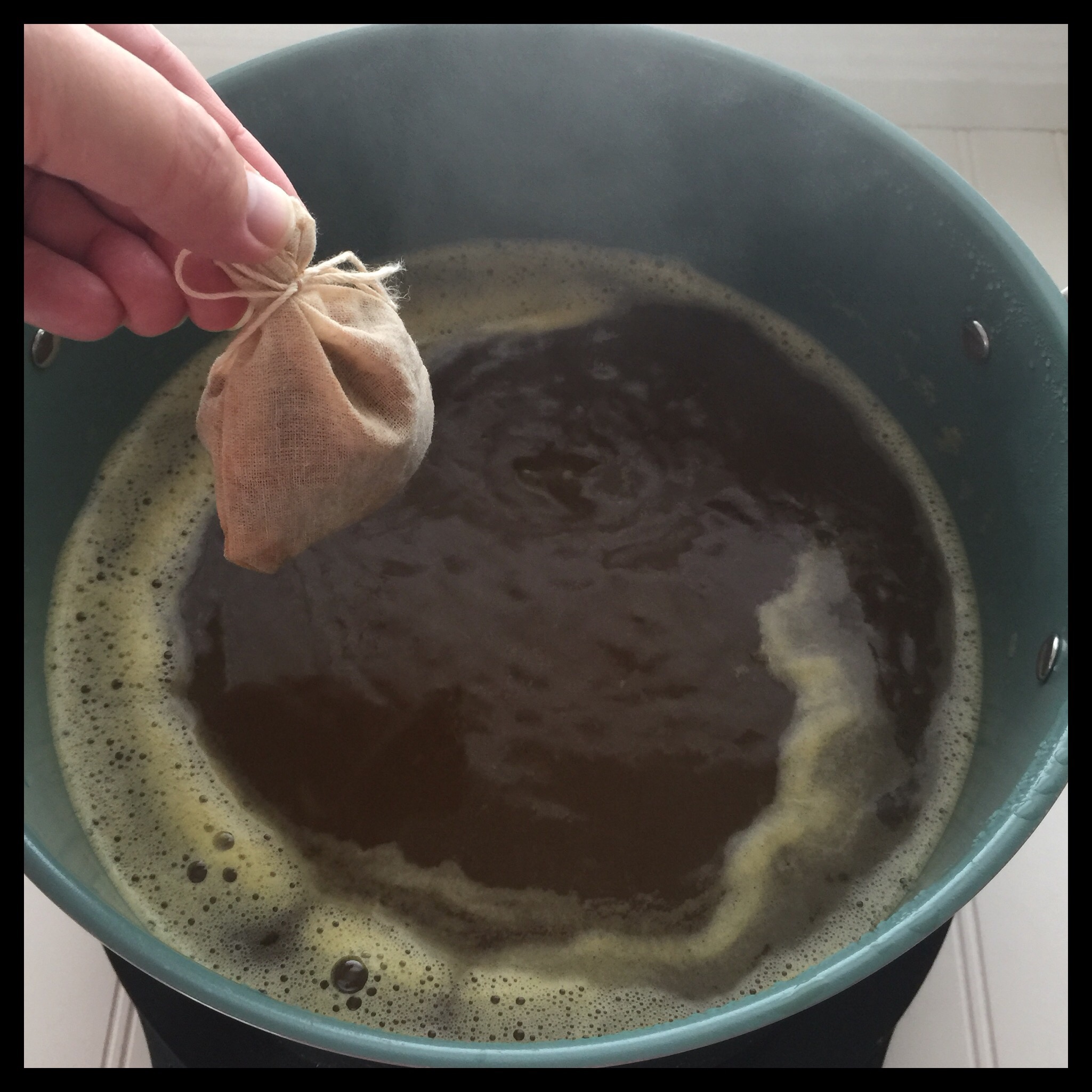 It will take 35 to 45 minutes for the cider to boil. Get your spices ready while you wait. I use a reusable tea bag that I got several years ago at Whole Foods and it works perfectly. You can also use eight layers of cheesecloth, but some of the apple pie spice will leak out.