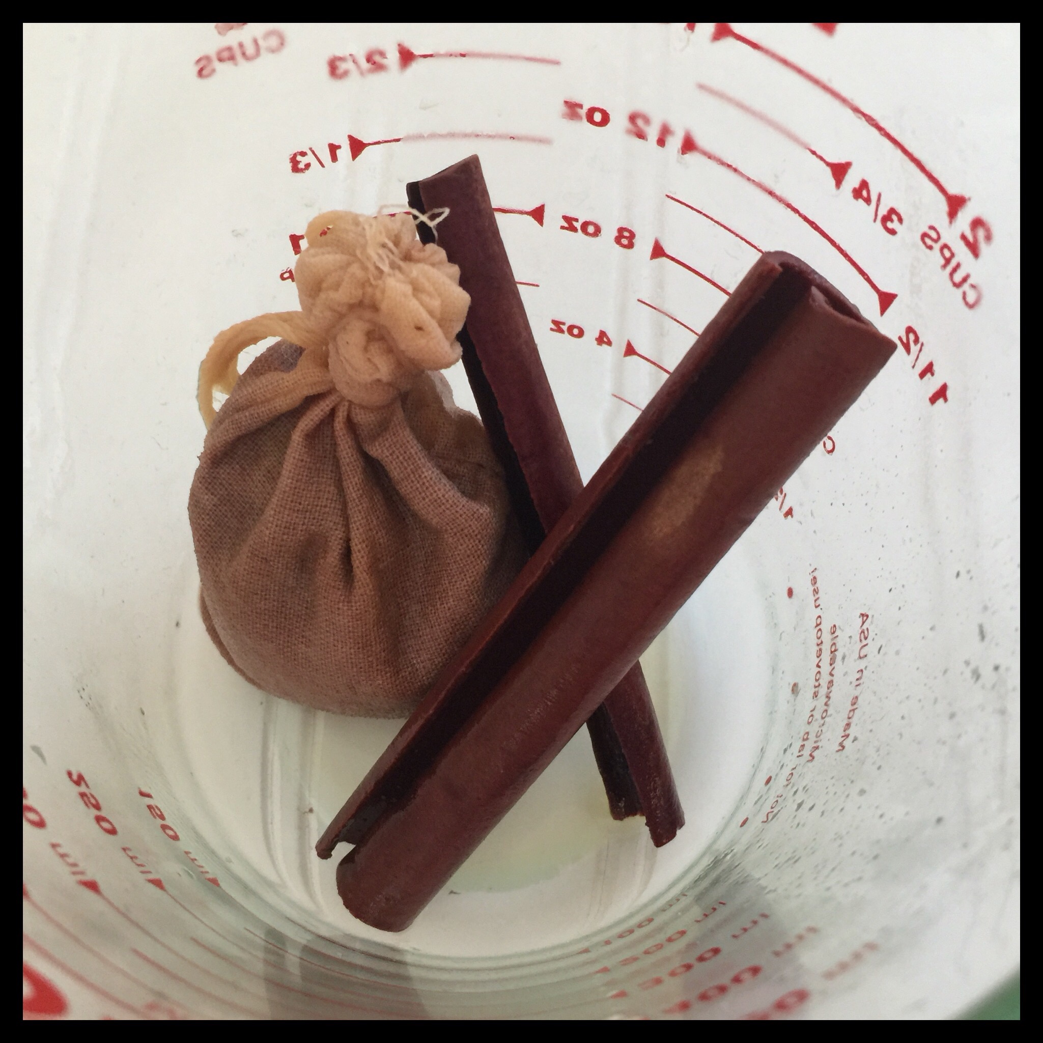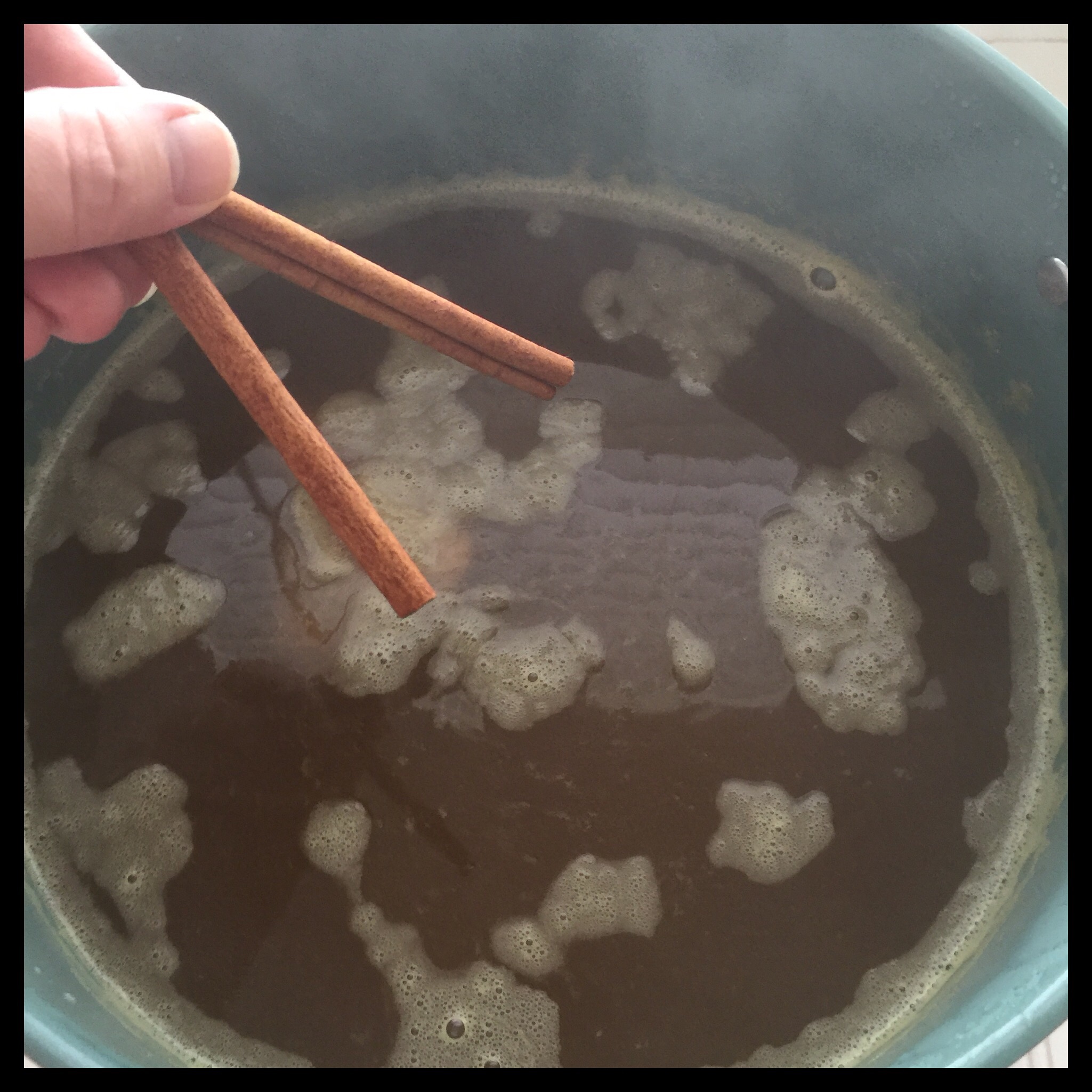 When your cider is boiling, remove the lid and add the spice bag and cinnamon sticks: