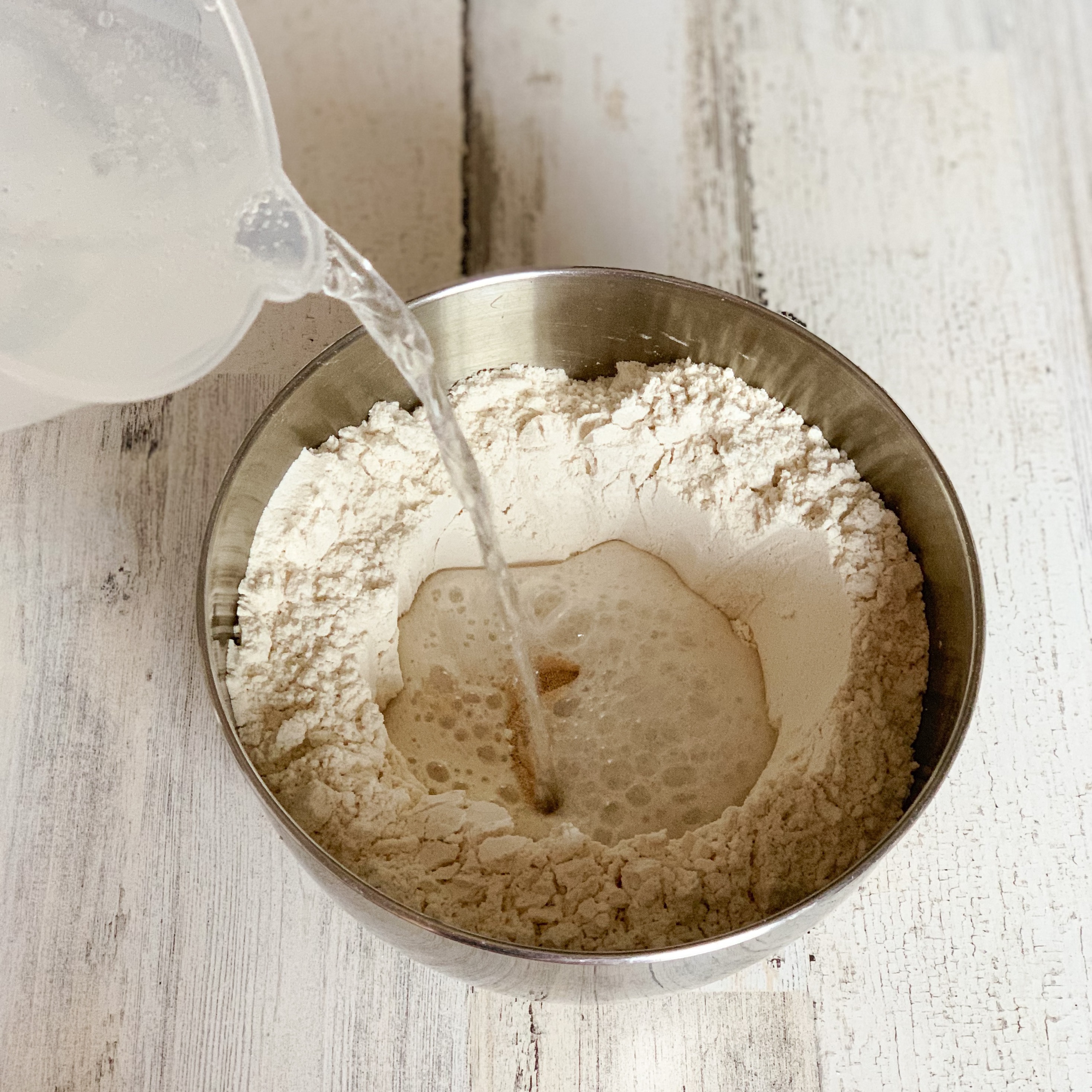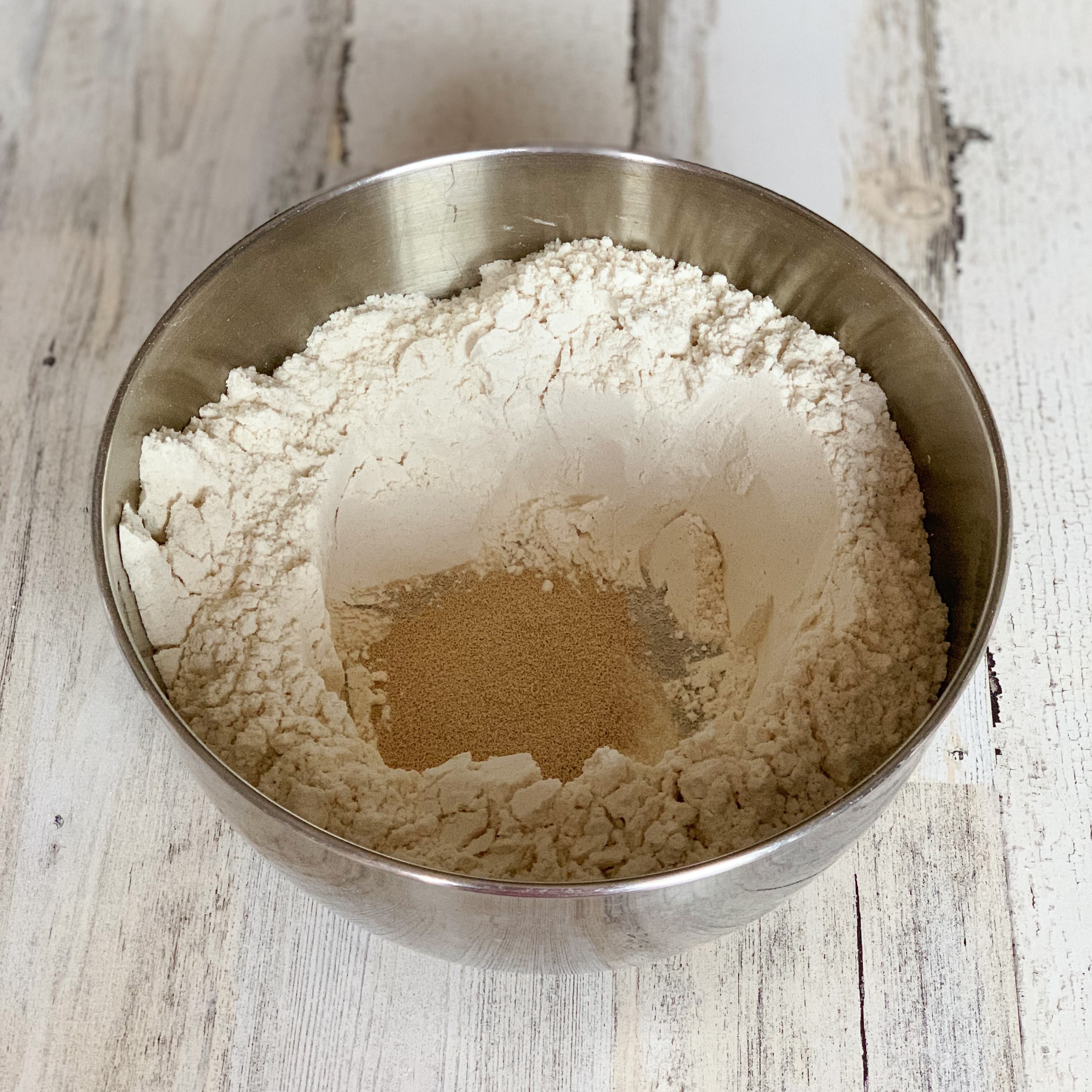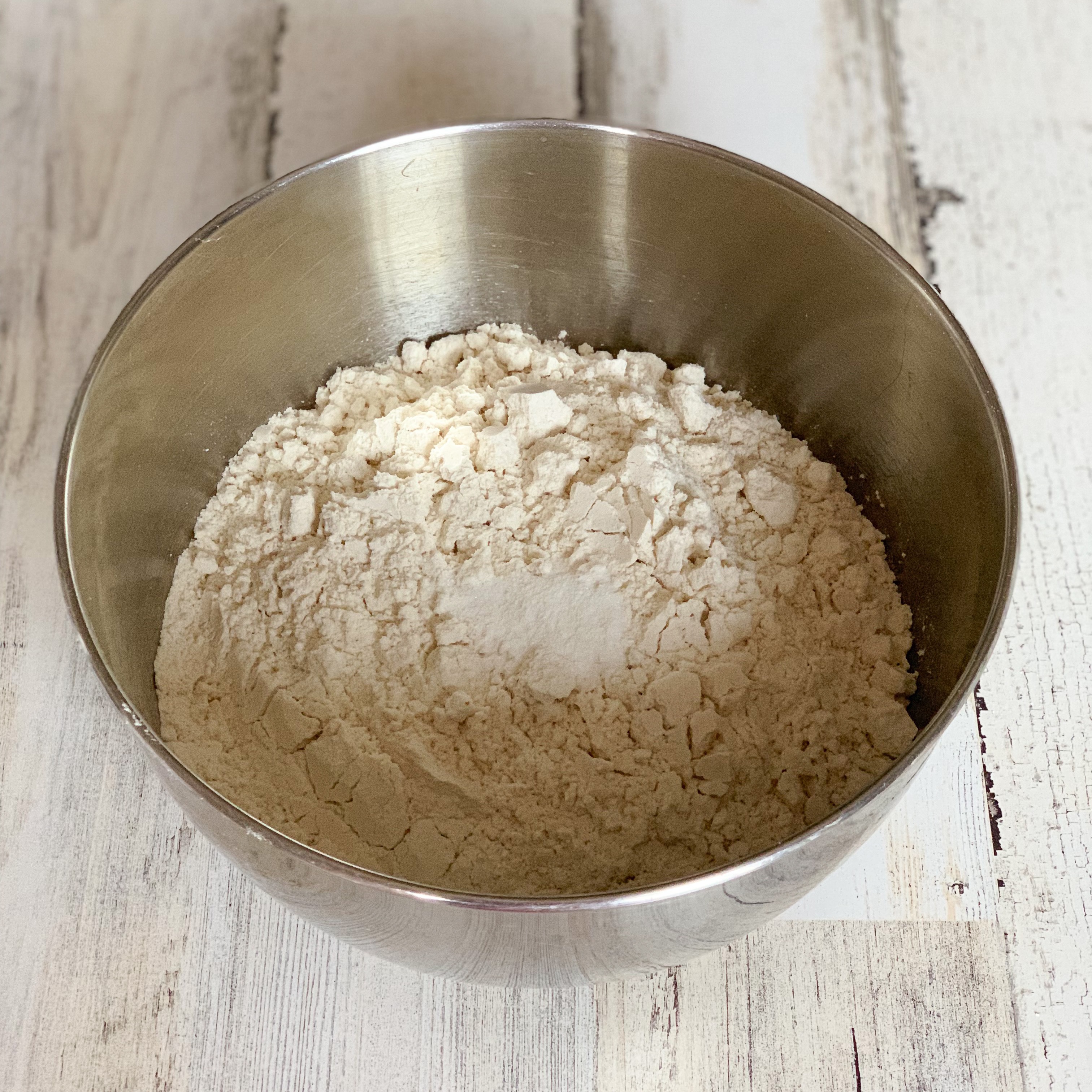 Add the vitamin C crystals and room-temperature flour to your stand mixing bowl, then whisk them together. (Leave out the vitamin C crystals if you will be using lemon juice and vinegar instead.)