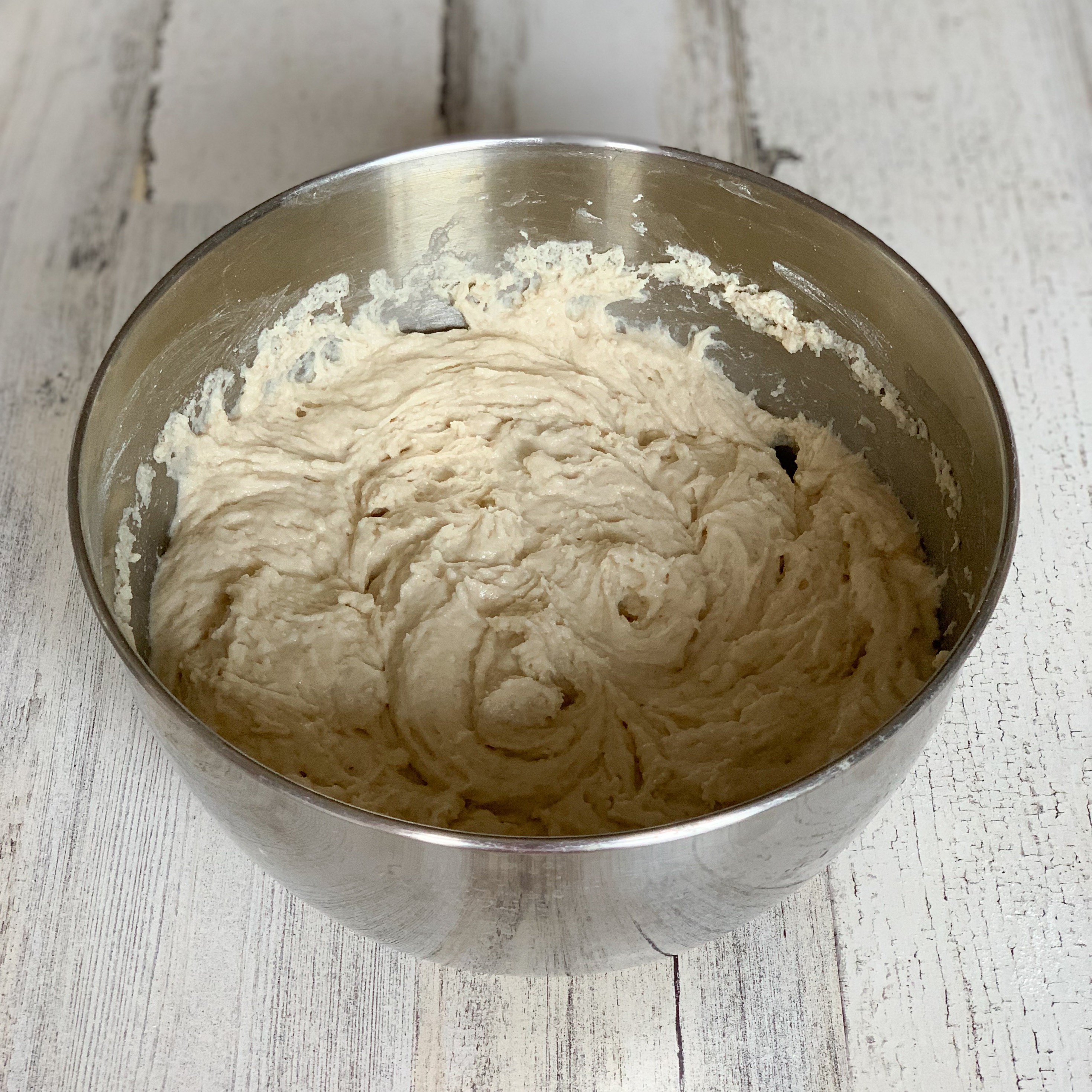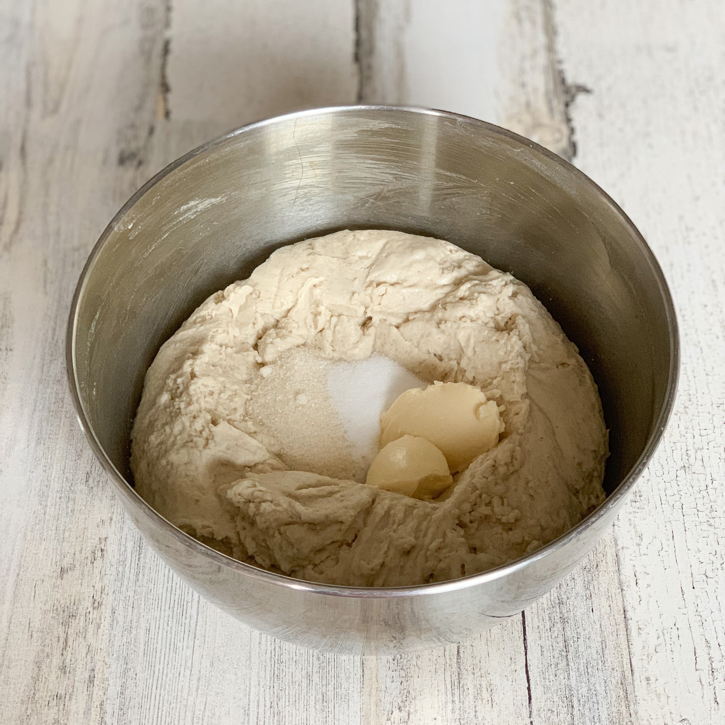 When your timer goes off, use a hand mixer with dough hooks to mix the dough for one to two minutes on medium speed just until the sugar, salt, and vegan butter are incorporated evenly into the dough. Use a sturdy spatula to scrape the bottom and sides of the bowl. Mix the dough by hand several times to be sure you adequately mix in the dough that was on the sides and the bottom of the bowl.
