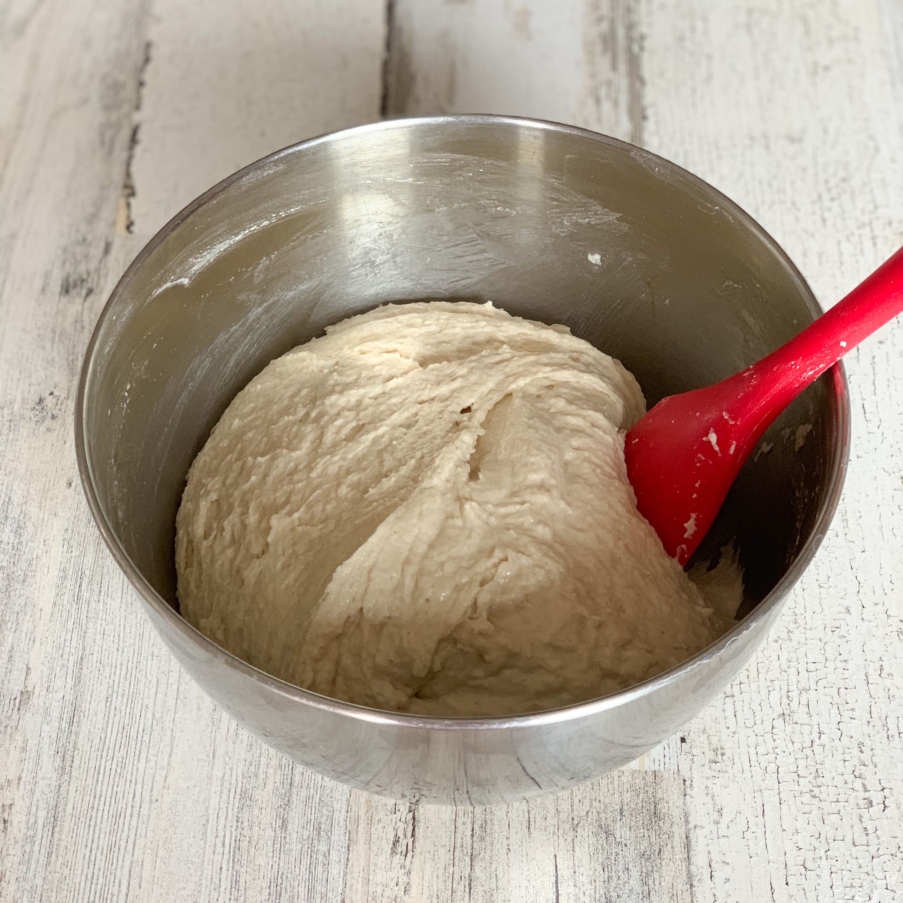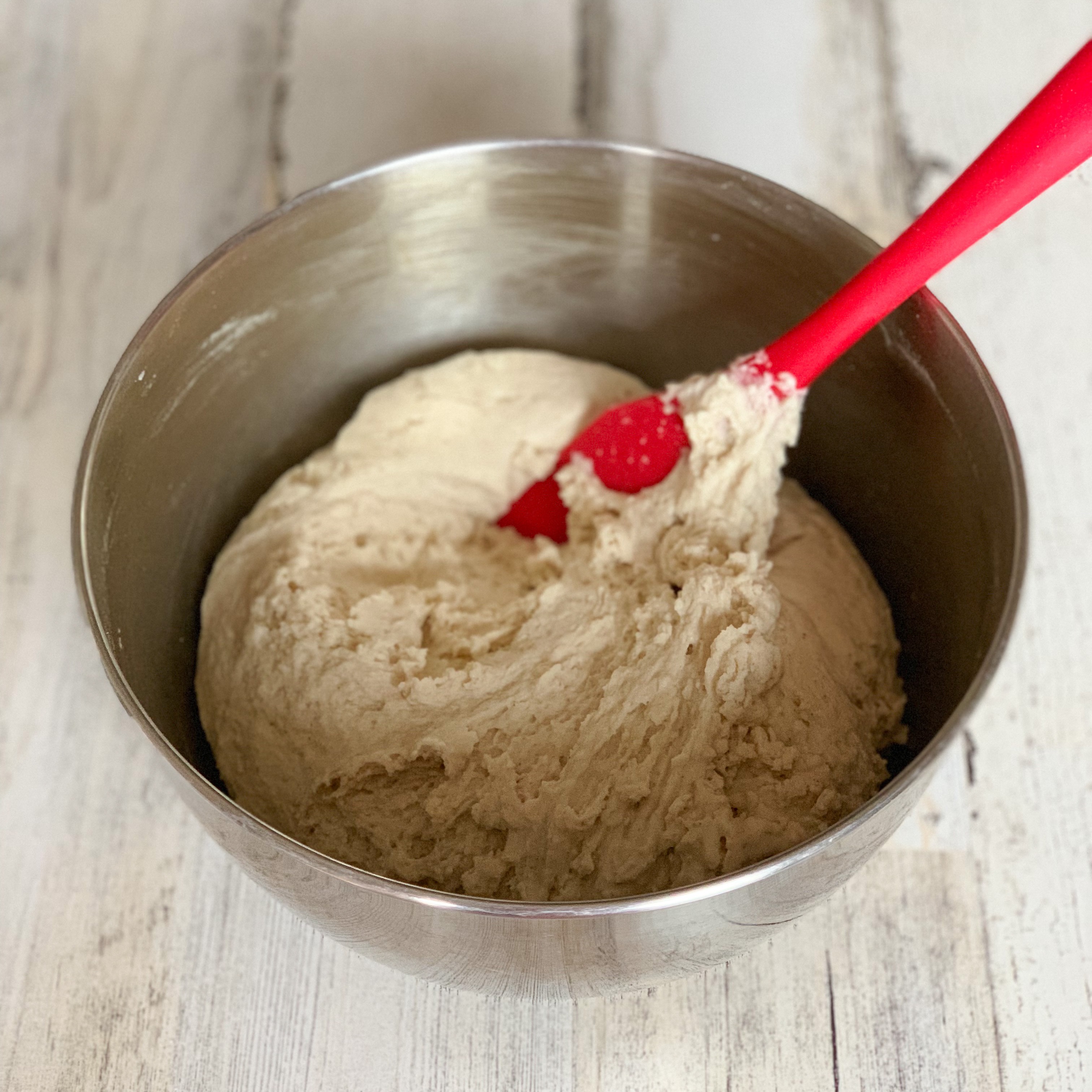 Use a sturdy spatula to scrape the bottom and sides of the bowl. Mix the dough by hand with a sturdy spatula several times to be sure you adequately mix in the dough that was on the sides and the bottom of the bowl: