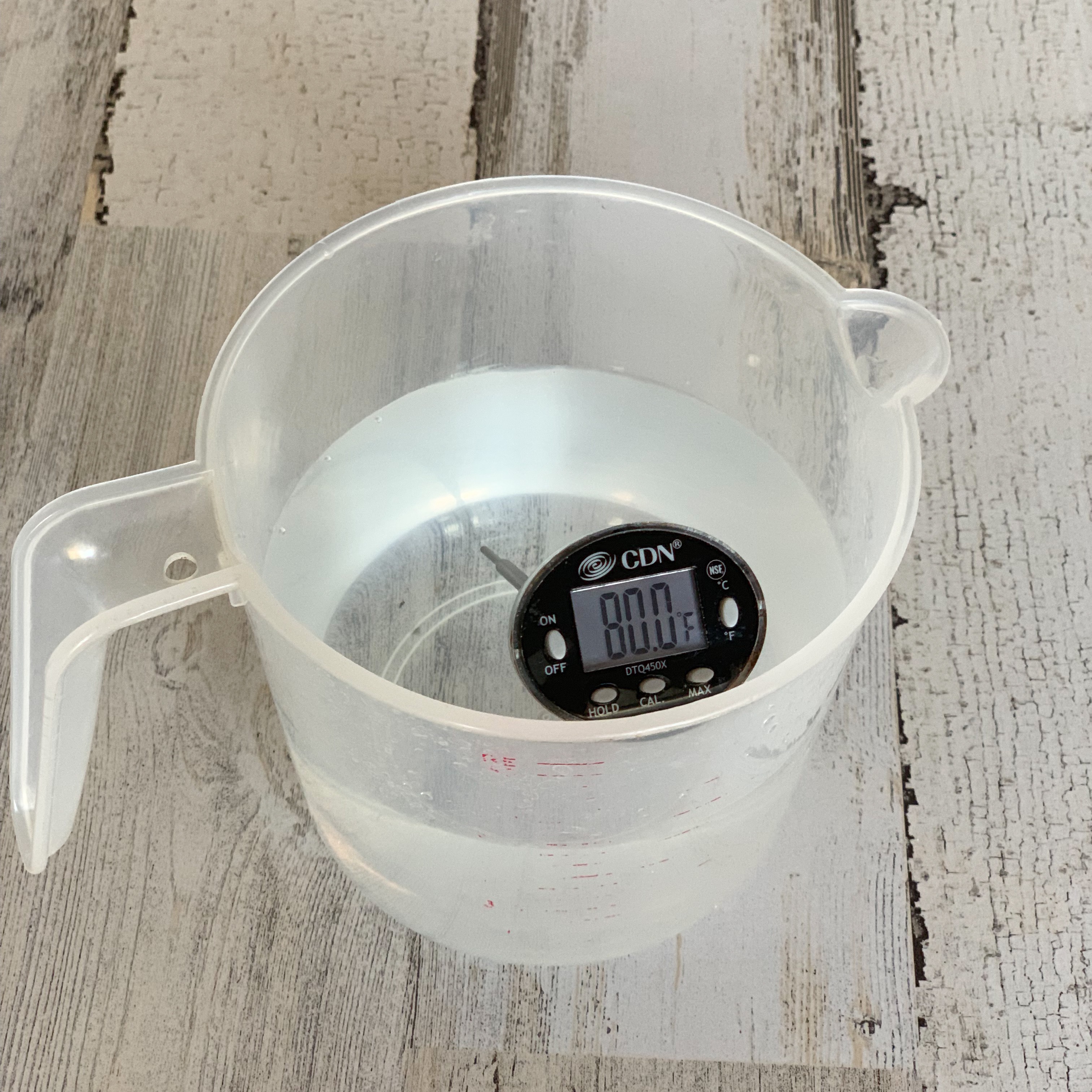 Warm your seltzer water to 80 degrees Fahrenheit. Use a thermometer to verify the temperature. If it is 74 degrees or more in your kitchen, just use room temperature seltzer water. Pour the seltzer water into the well, then set a timer and wait five minutes to let the yeast get bubbly. (For using lemon juice and vinegar instead of vitamin C crystals, decrease the amount of seltzer water to 855 grams, and add 22 g of lemon juice and 23 g of distilled vinegar to the water in the well after the yeast gets bubbly.)