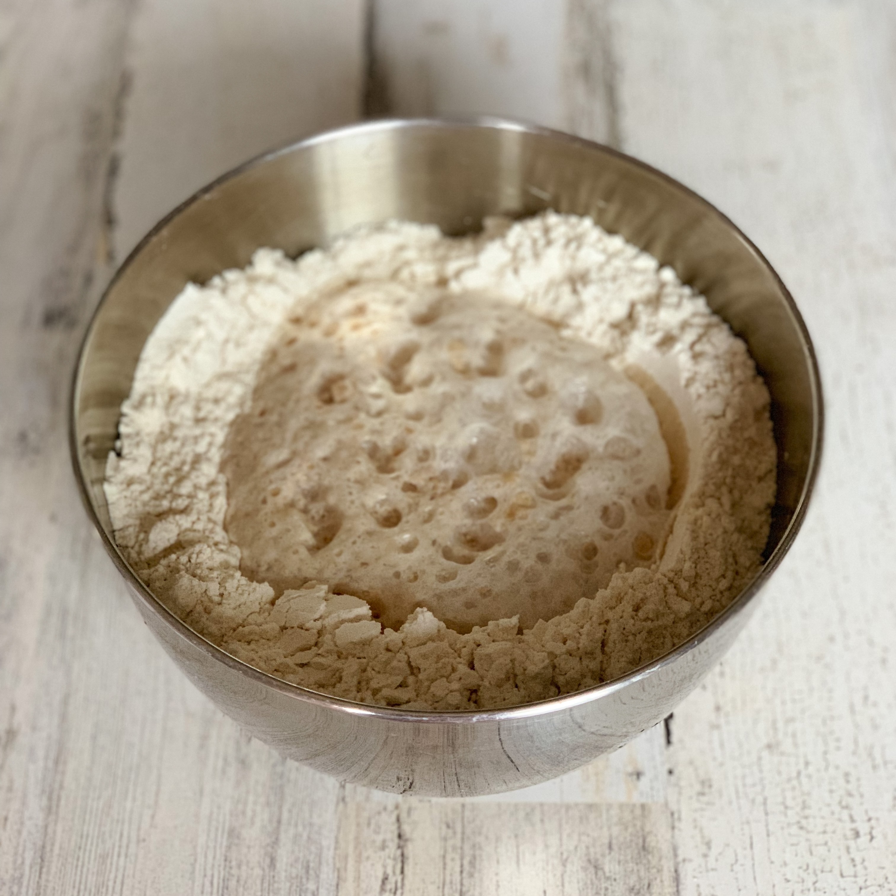 Make a well in the flour, then add the smaller amount of sugar and the yeast to the well. You can use either quick rise or active dry yeast in all of my bread recipes.