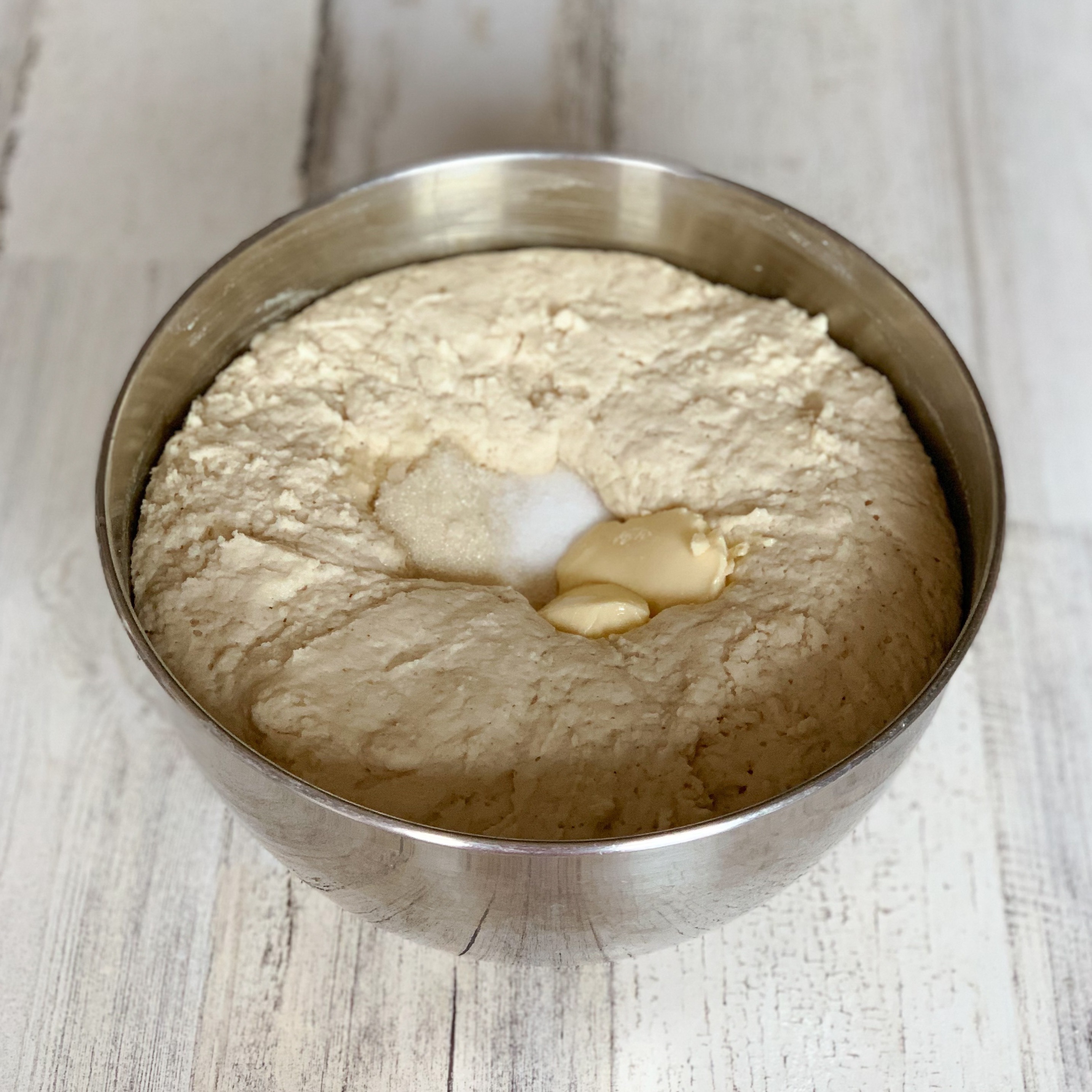 Make a well in the dough, then add the larger amount of sugar, the salt, and the vegan butter to the well. DO NOT stir them in yet!