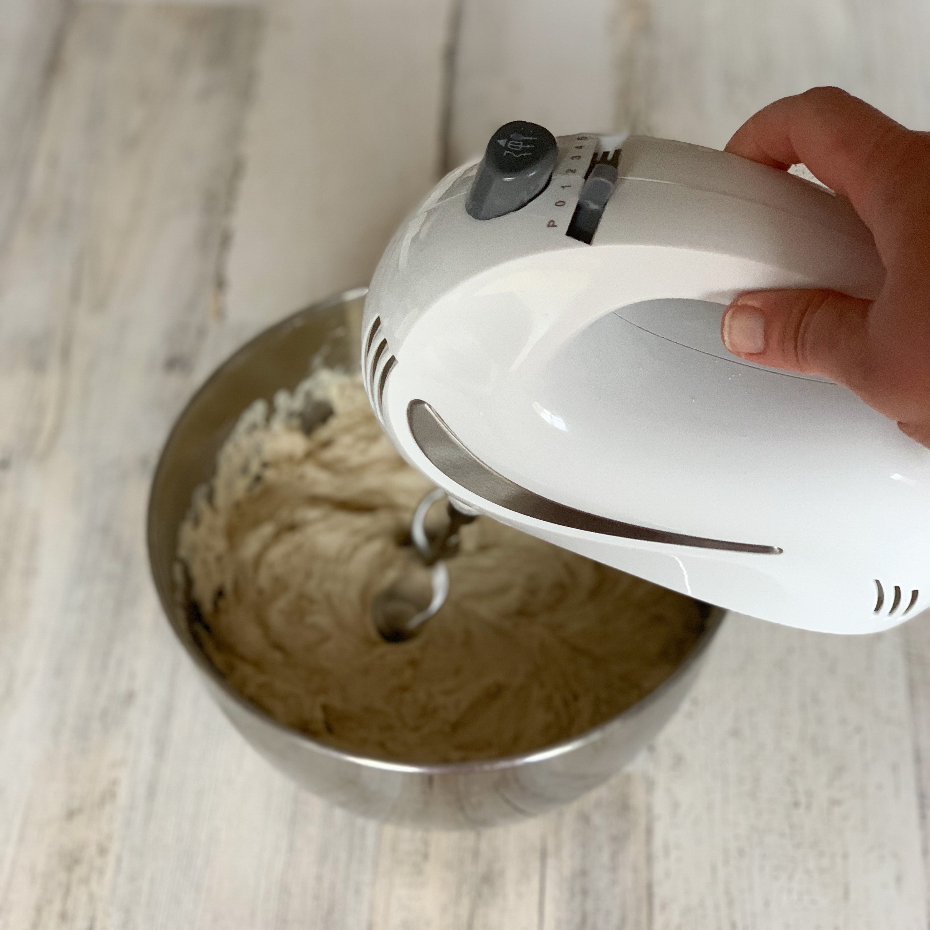 When your timer goes off, use a hand mixer with dough hooks to mix the dough for one-and-a-half to two minutes on medium speed just until the sugar, salt, and vegan butter are incorporated evenly into the dough. Use a sturdy spatula to scrape the bottom and sides of the bowl. Mix the dough by hand several times to be sure you adequately mix in the dough that was on the sides and the bottom of the bowl.