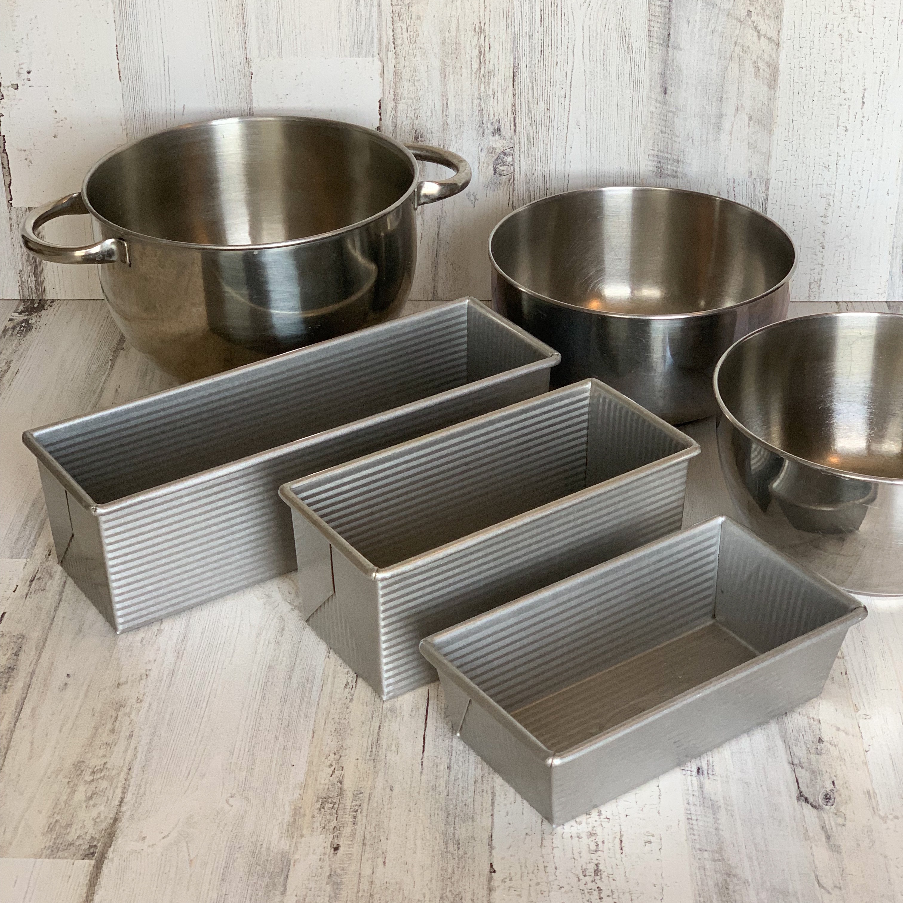 You will find three recipes below, one for each of the sizes shown here. The bread on the left was baked in a large Pullman pan (13″ x 4″ x 4″) and is a proper bakery-sized loaf. The one in the middle was baked in a small Pullman pan (9″ x 4″ x 4″), and the small one on the right was baked in a standard 8.5″ x 4.5″ x 2.75″ loaf pan. I prefer the straight sides of the Pullman pans, but you can also use a regular 9″ x 5″ loaf pan for the medium-sized bread. I do not recommend using glass, cast iron, or silicone pans for bread baking.