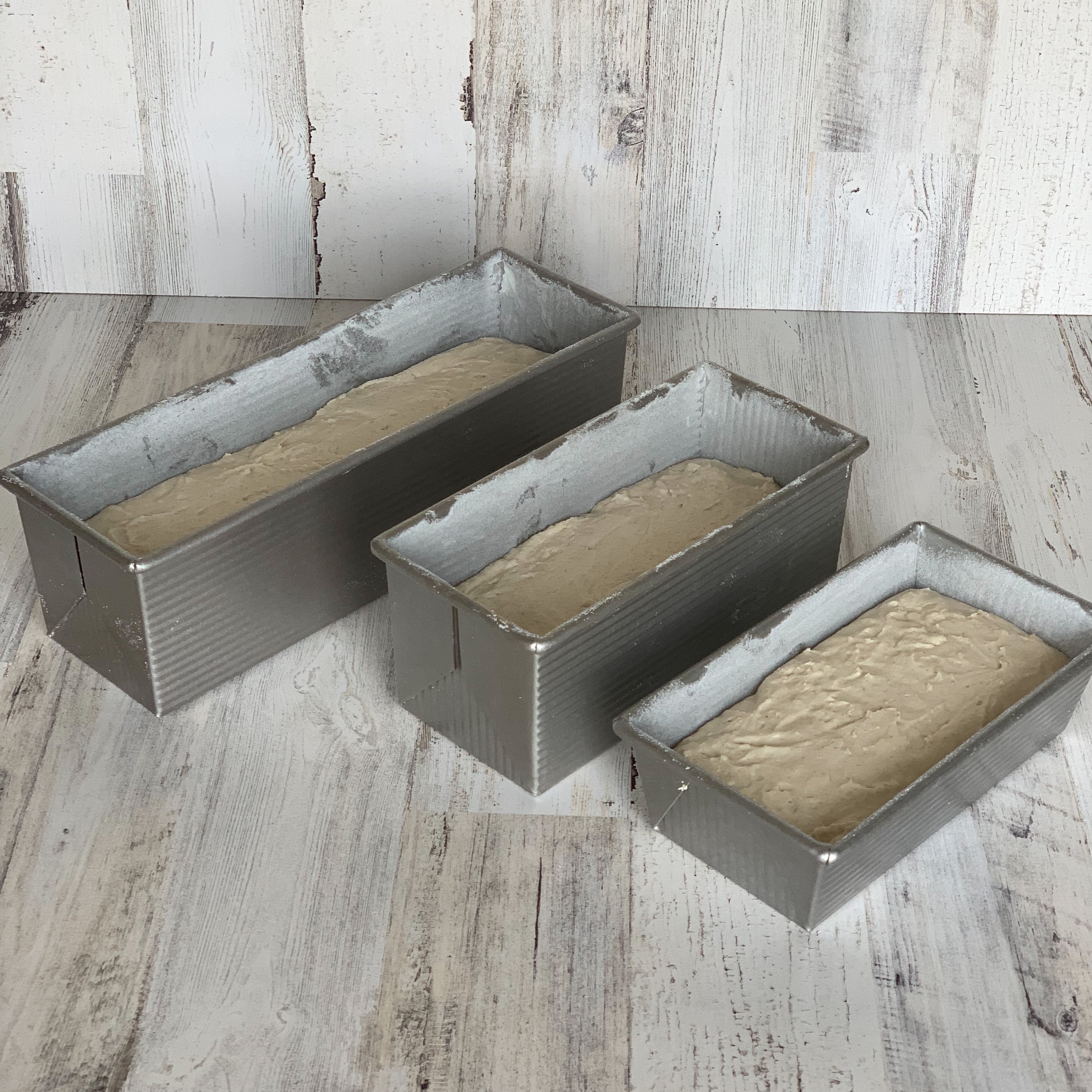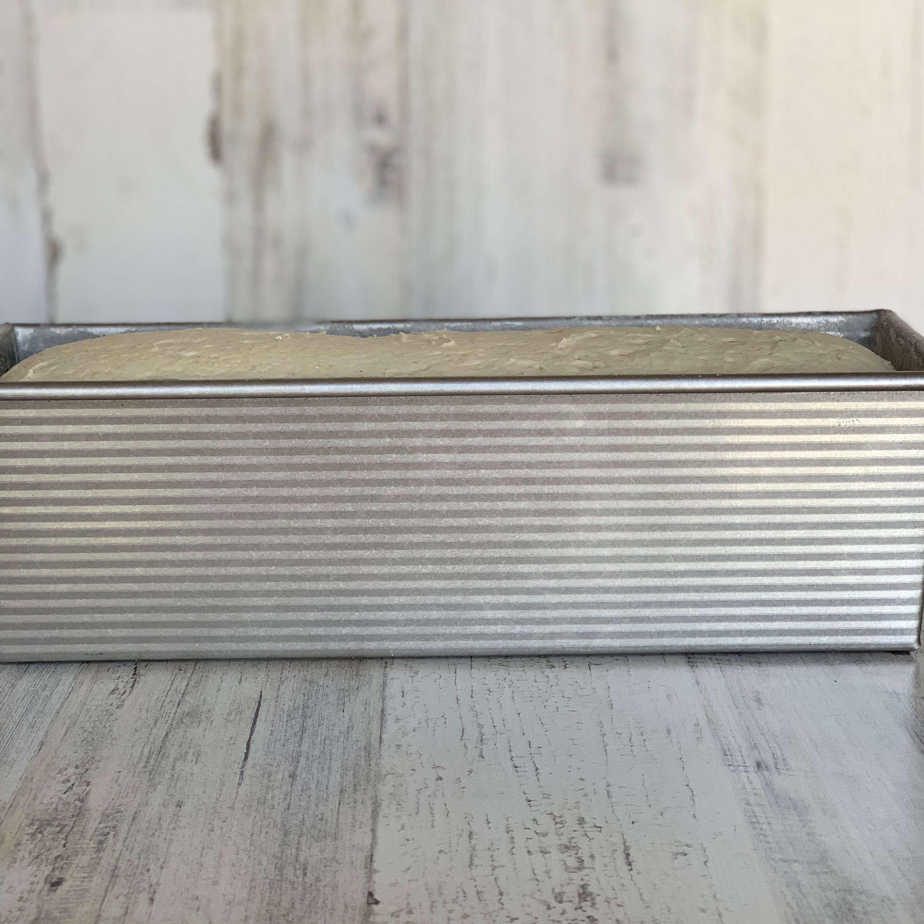 For the large recipe in a 13″ x 4″ x 4″ Pullman pan, or the medium recipe in a 9″ x 4″ x 4″ Pullman pan, the middle of the dough should just be even with the top of the pan when viewed from eye level. With standard pans that are only 2 3/4″ to 3″ tall, the middle of the dough should be about 1/2″ above the top of the pan.