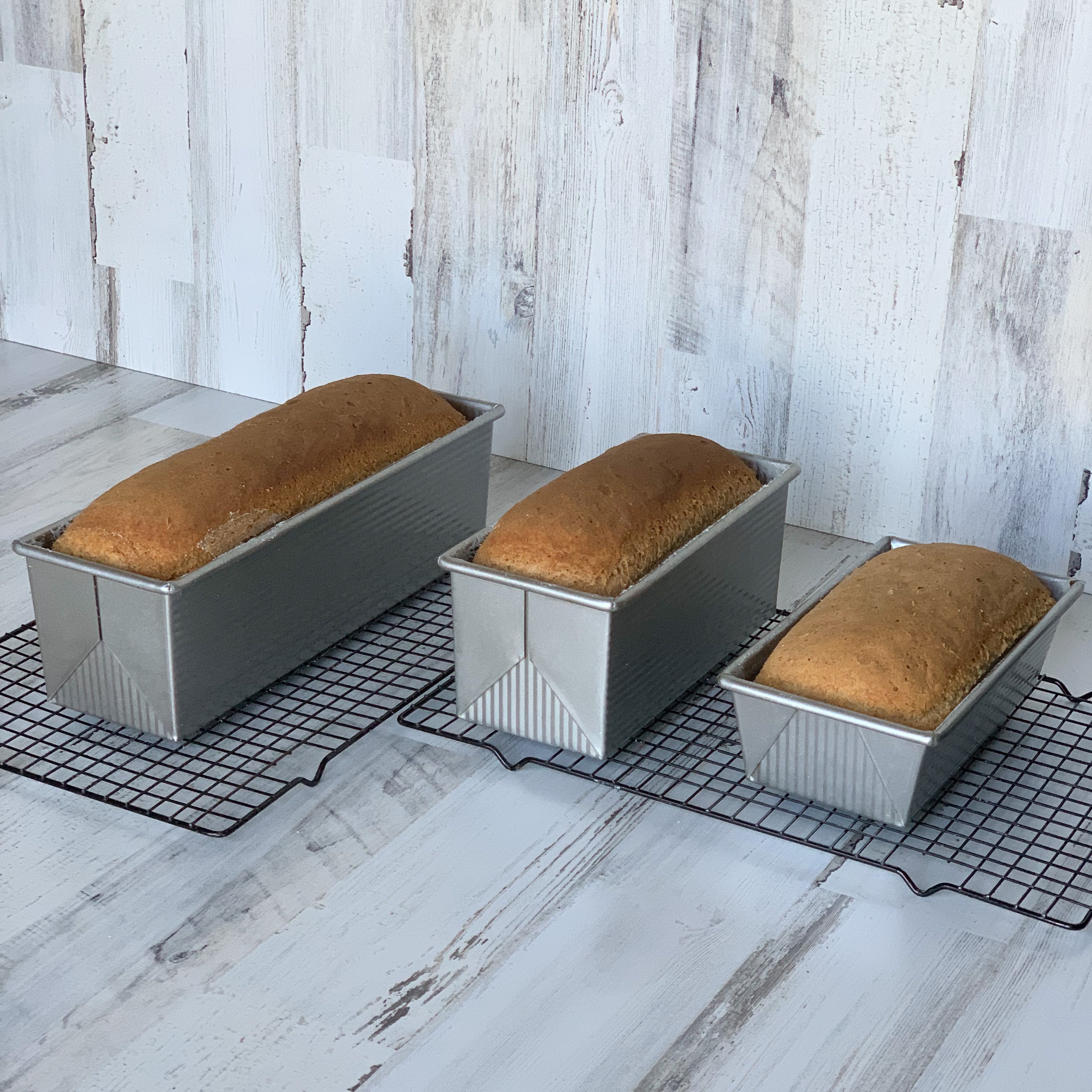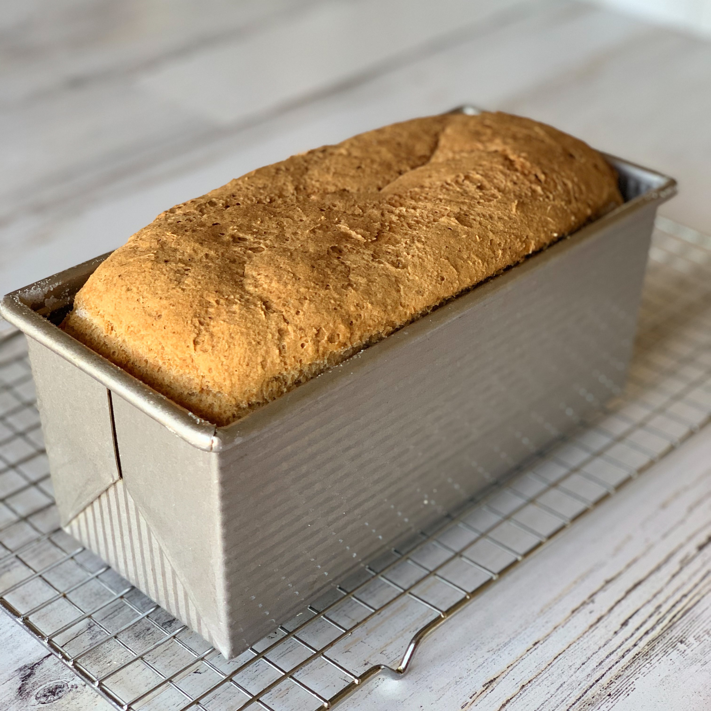 Make a beautiful, soft, and fluffy loaf of vegan and gluten free bread in a 13" x 4" x 4" large Pullman pan. No xanthan gum, guar gum, or eggs are needed to make this amazing bread!