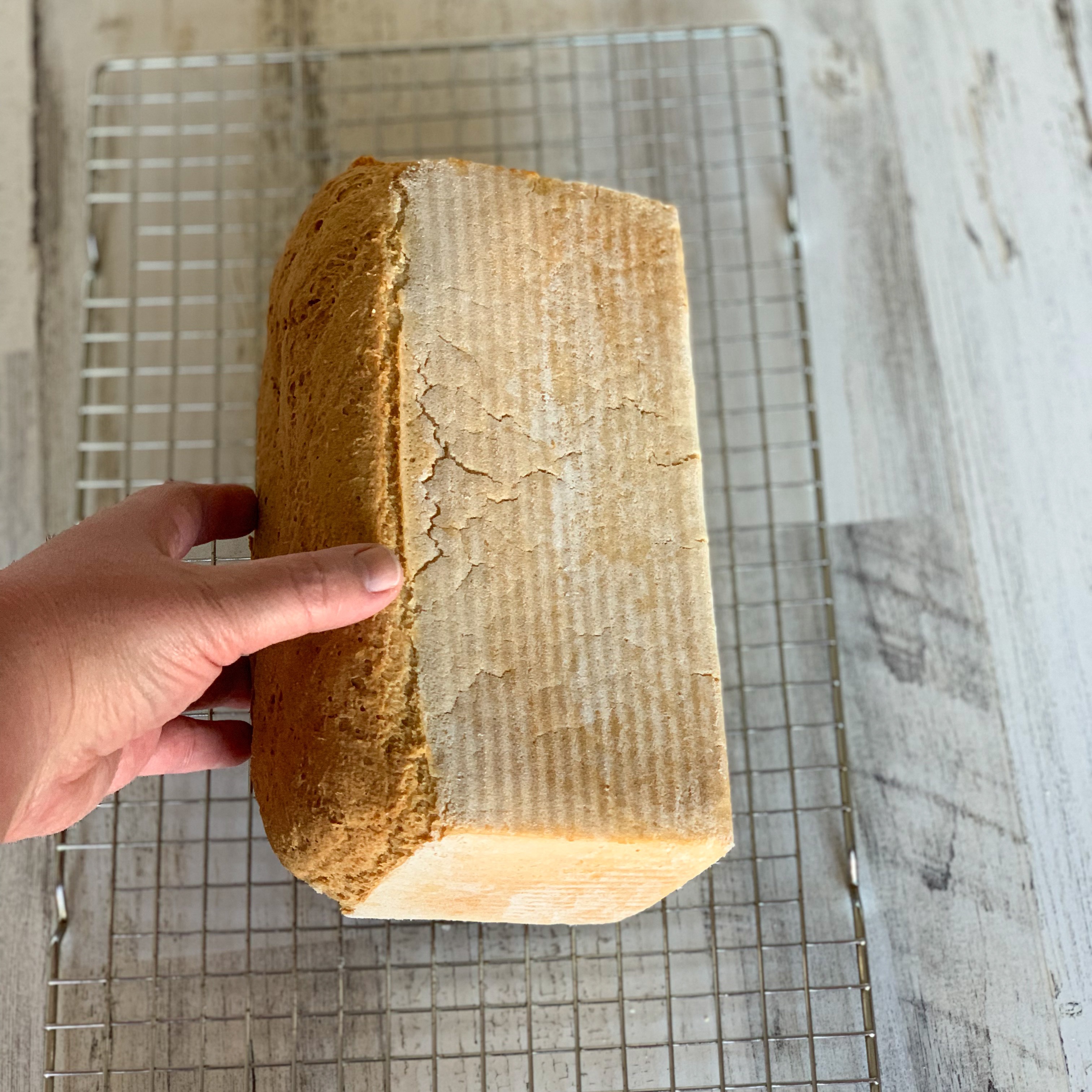 When your timer goes off, remove your bread from the oven. Gently slide your loaf out of the pan on its side onto a cooling rack. Set a timer for 10 minutes, and turn the loaf onto the opposite side when it goes off. Do the same for 20 minutes, then 30 minutes. After that, you can stand your loaf upright to finish cooling completely.