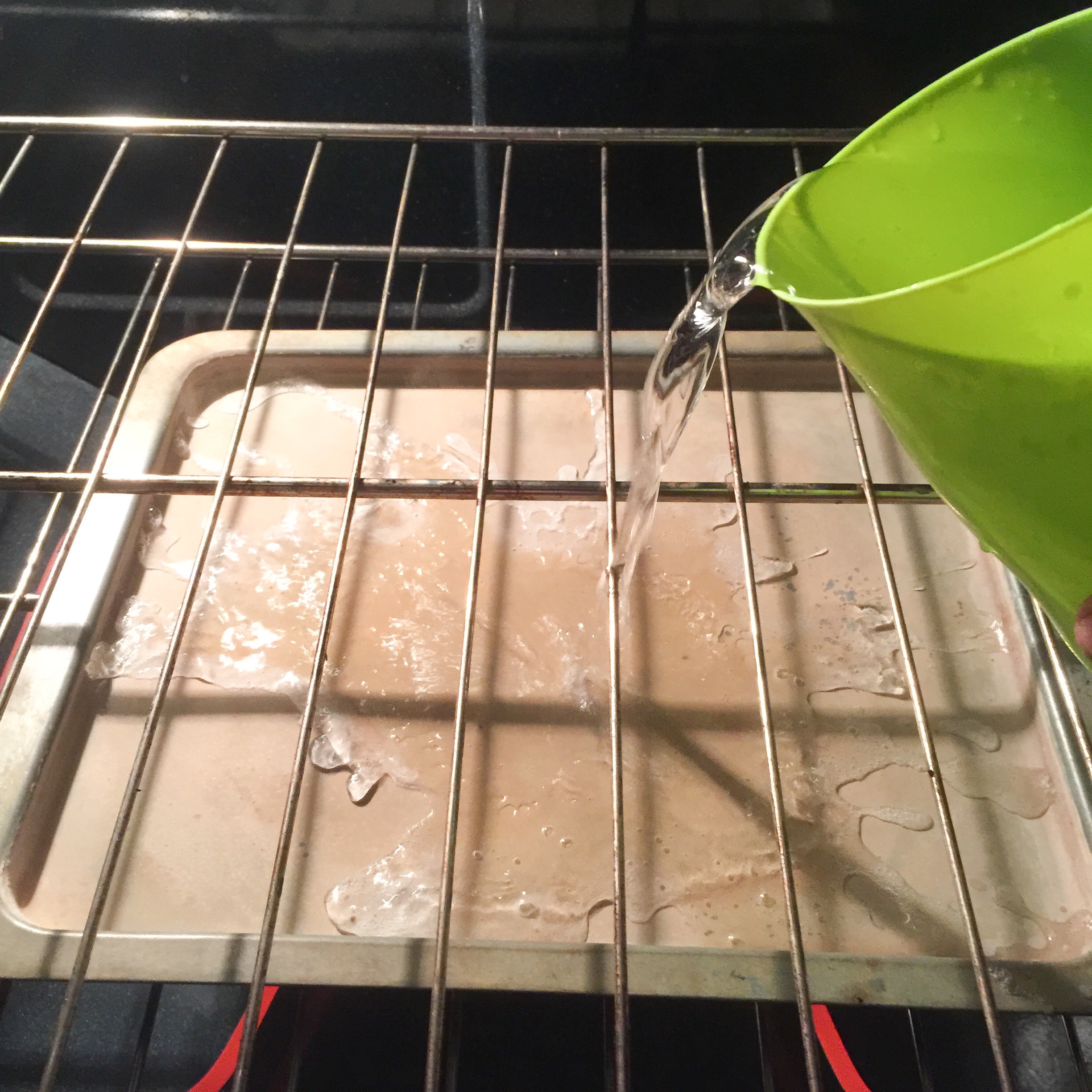 As soon as the pan is in the bag, pour water into the pan you should already have on the bottom rack of your oven for this purpose. Turn your oven on to 400 degrees Fahrenheit to preheat while your dough is rising. If your dough takes more than 25 to 30 minutes to rise, top off the water level in the pan. The water needs to be at least a 1/4" deep when you put the bread in the oven.