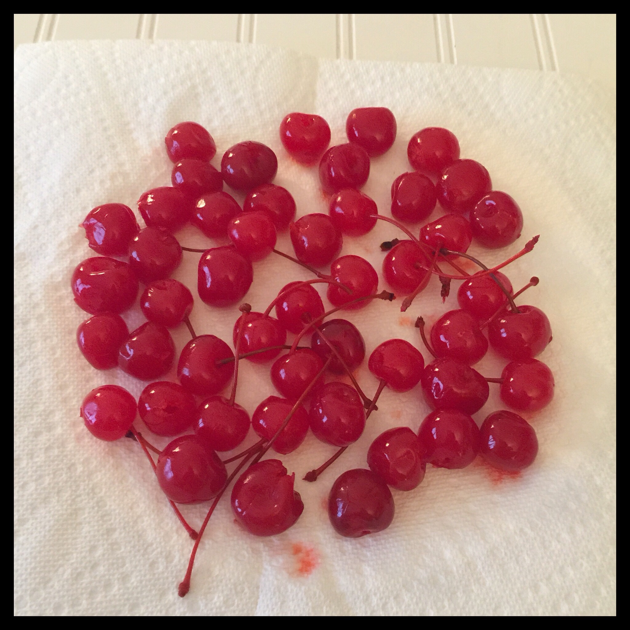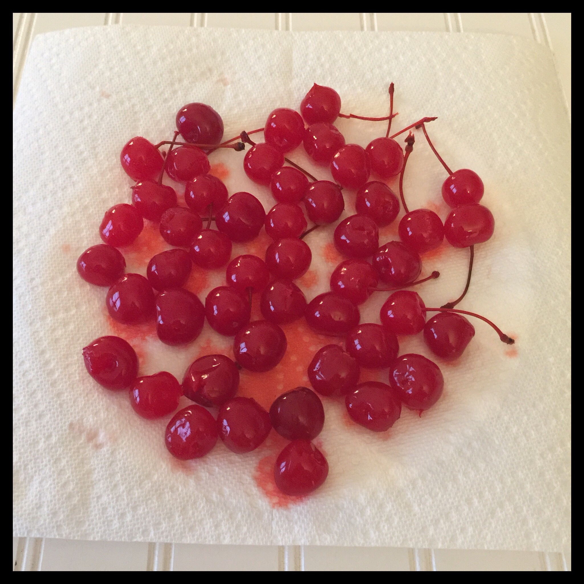 Drain the maraschino cherries, reserving a tablespoon of the liquid. Place the drained cherries on a paper towel-lined plate, then cover them with another paper towel. Press gently to remove any liquid from inside the cherries. Transfer the dried cherries to a fresh paper towel.