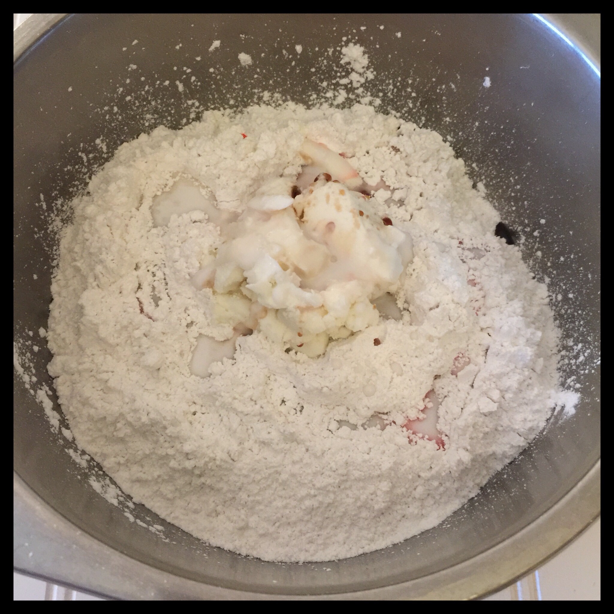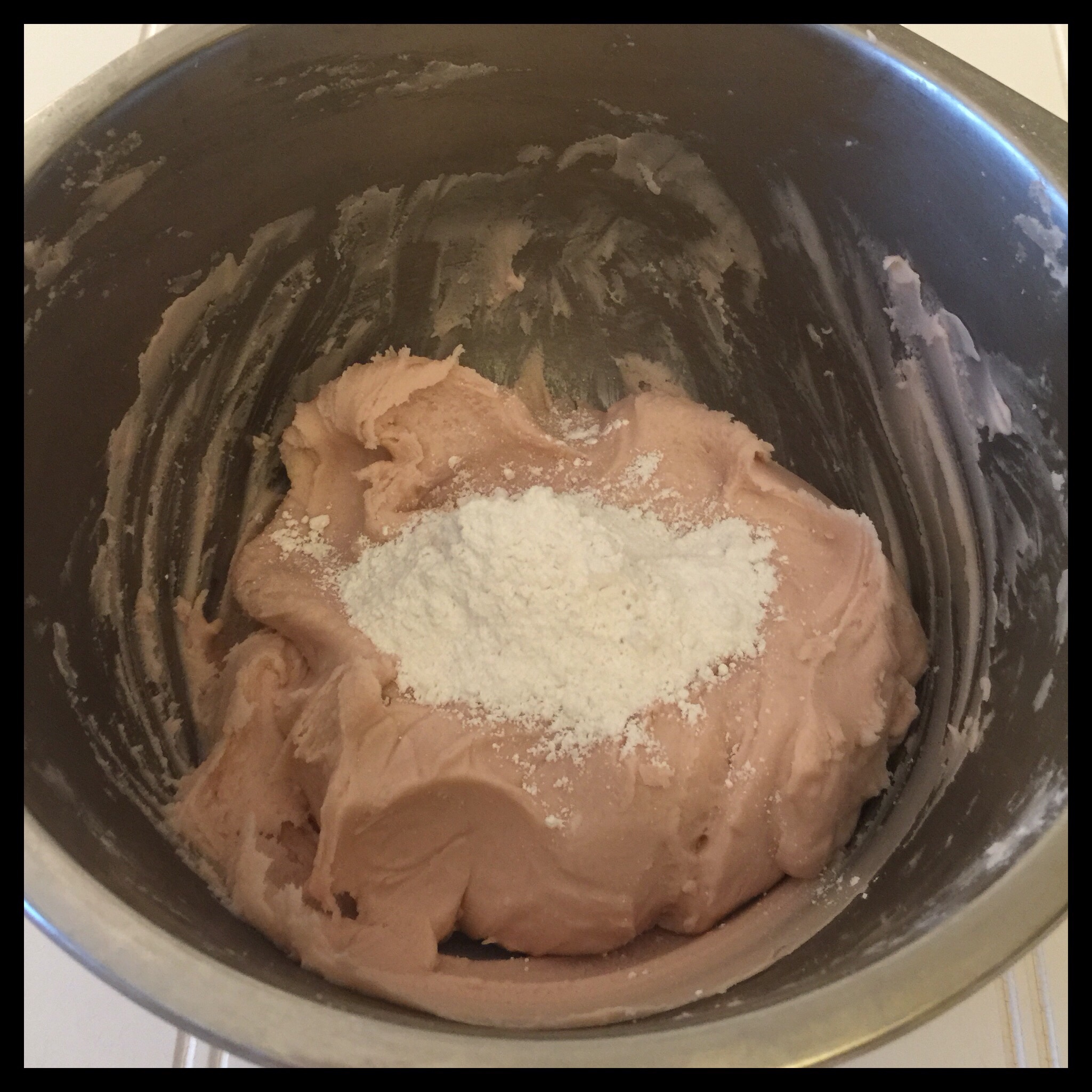 Add the vegan powdered sugar, the 40 g of shortening, vanilla, salt, coconut milk, and reserved cherry juice to a mixing bowl: