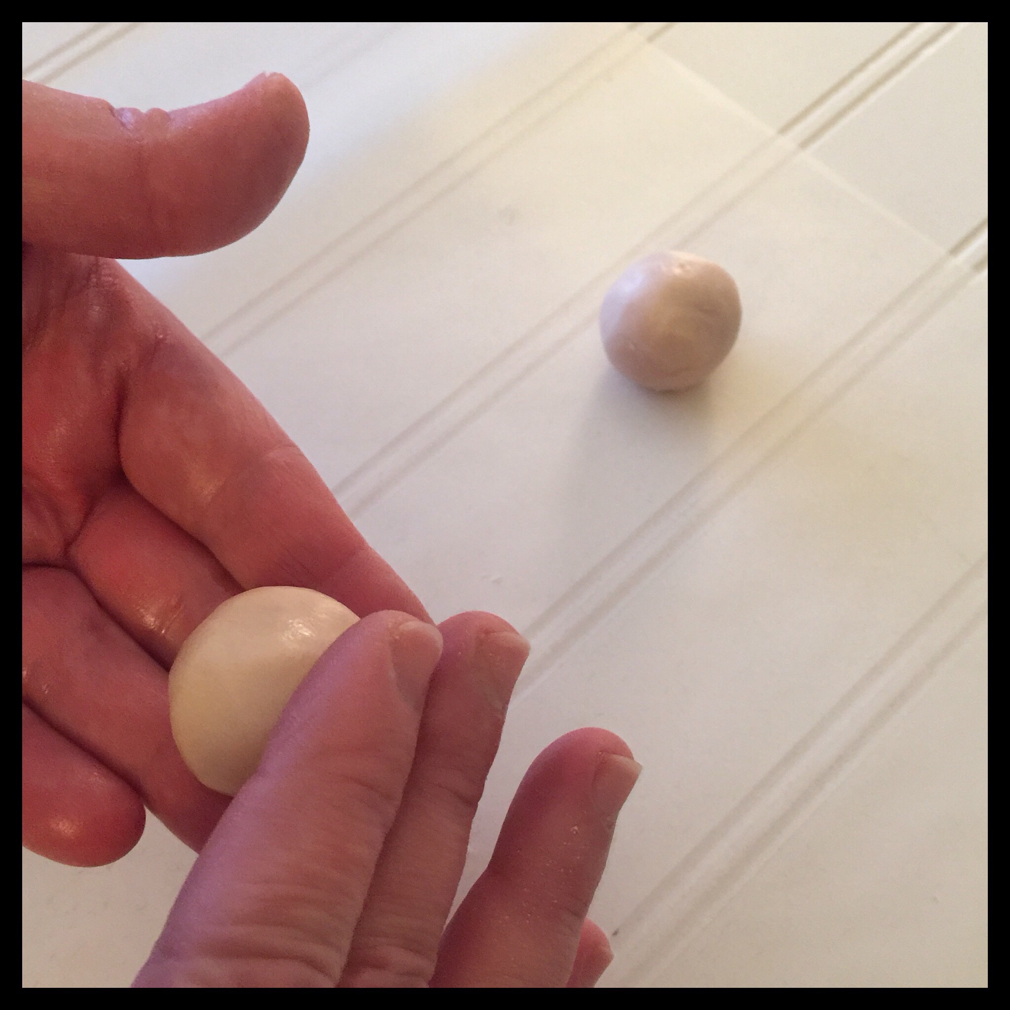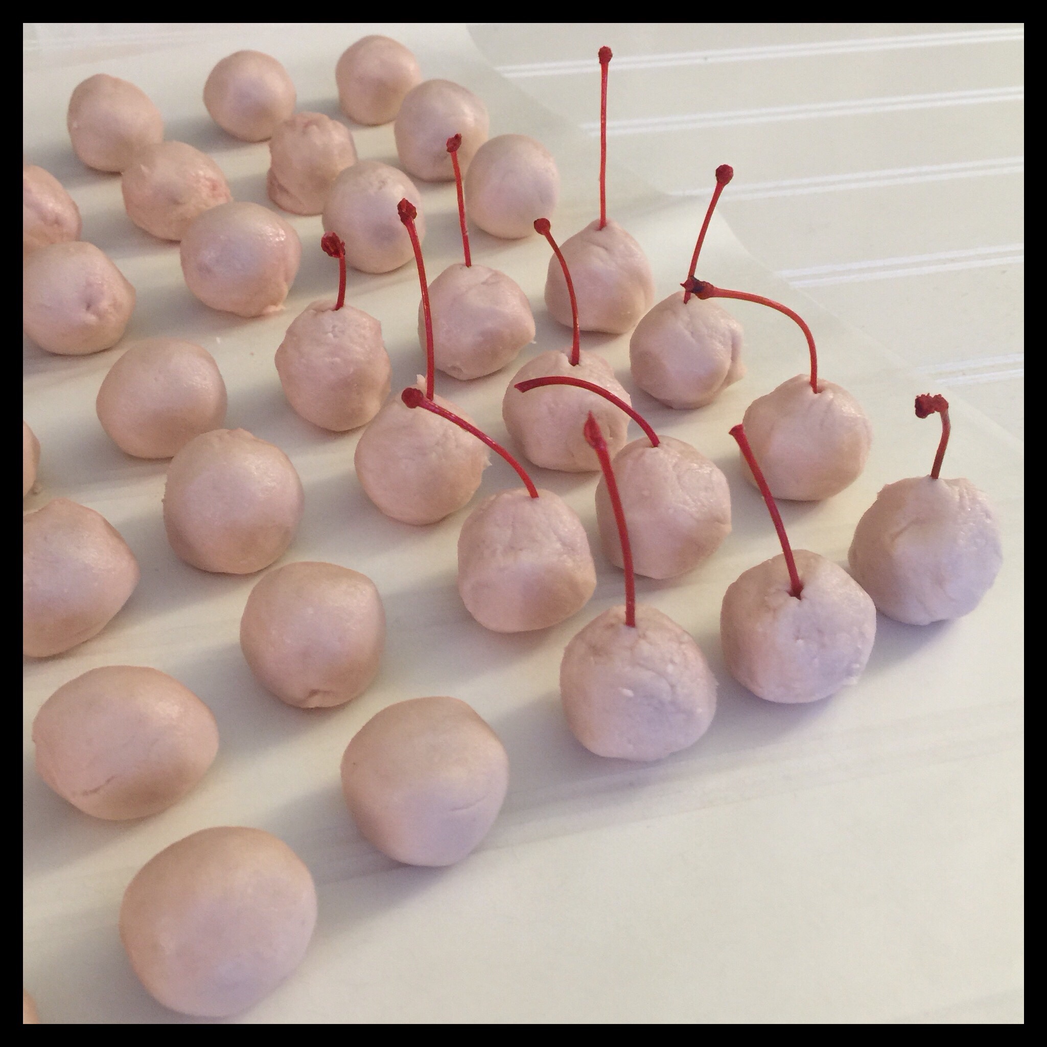 Pinch off a piece of fondant the size of the cherry you are coating. (You will get different sizes of cherries, so this way of determining how much fondant to use works the best.) Roll the piece of fondant into a ball.