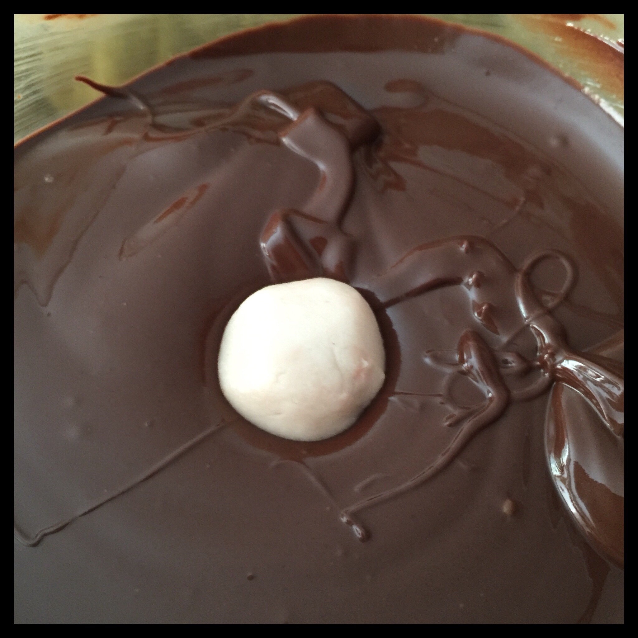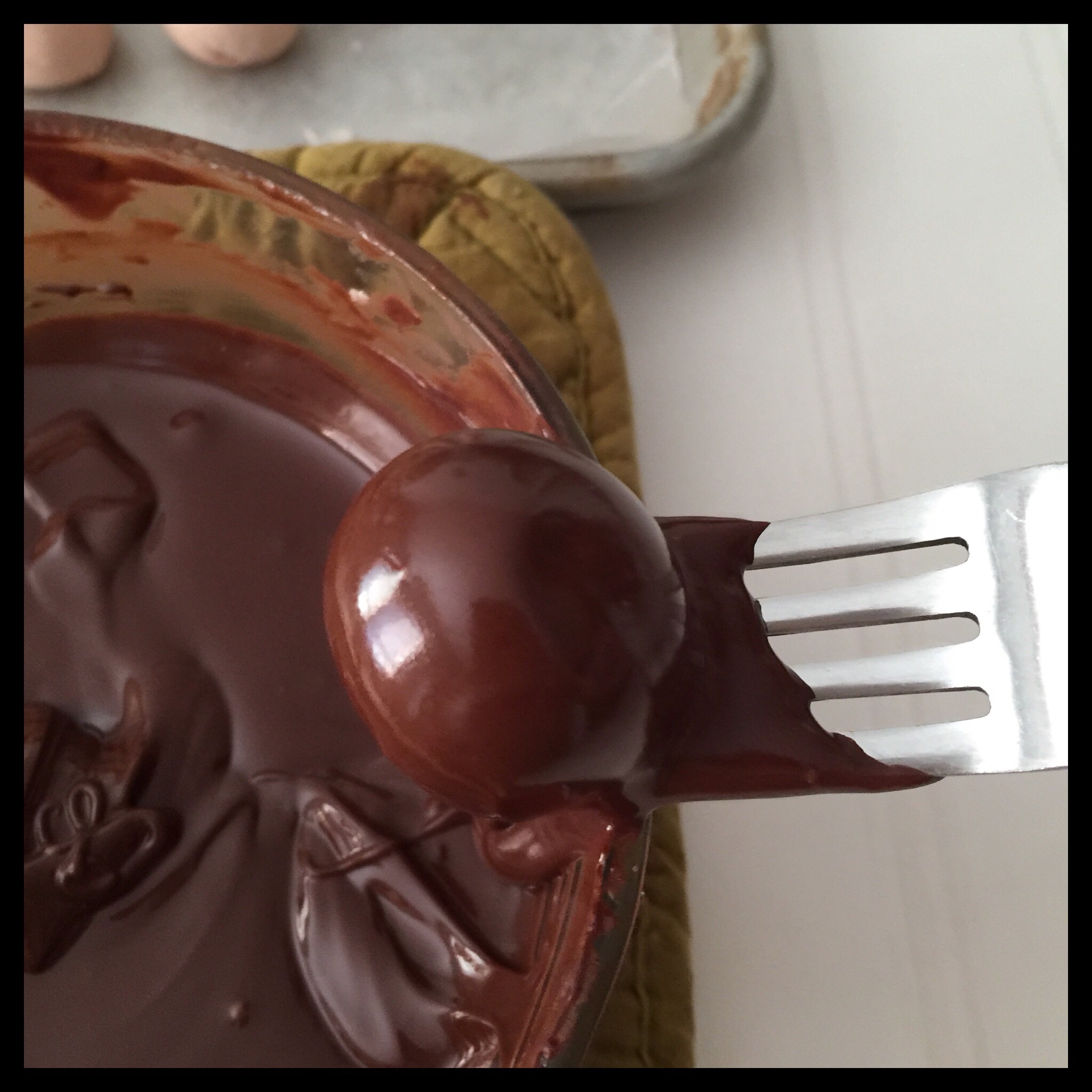 Once your fondant-covered cherries are chilled, temper half of your chocolate chips by following the directions on my post on how to temper chocolate. Remove half of your cherries from the fridge and dip them in the tempered chocolate.