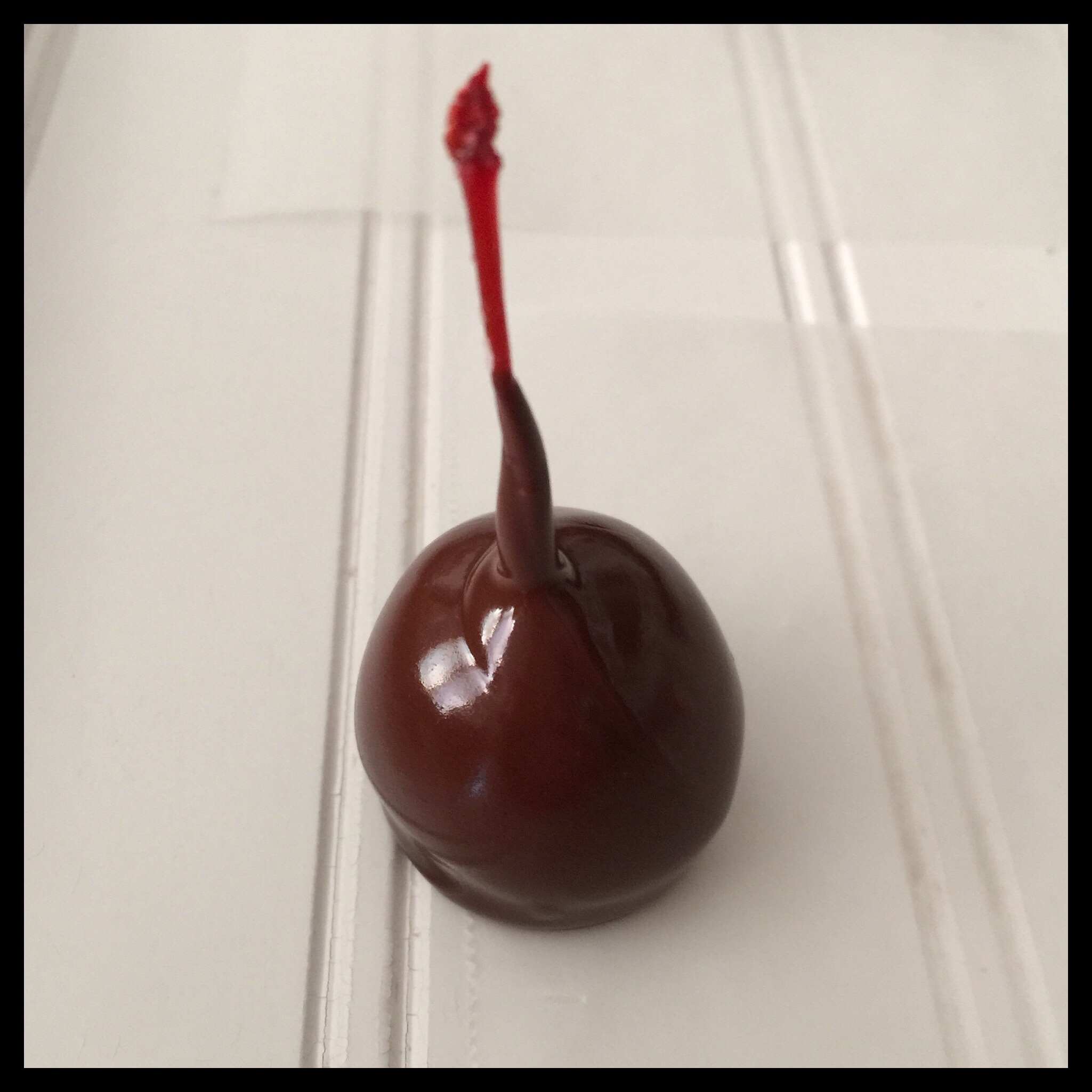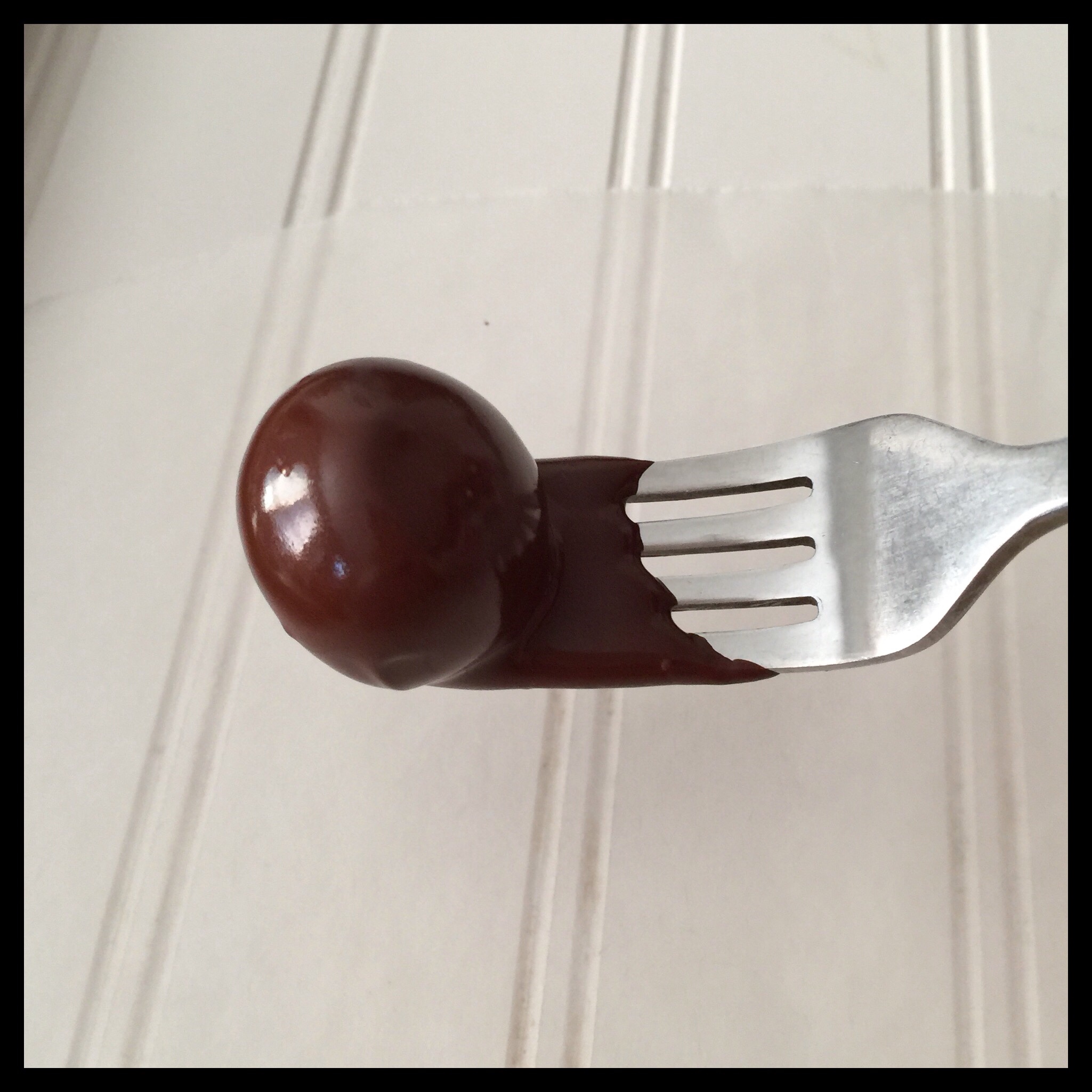 Lift it out, allow the excess chocolate to drop off, then carefully place the dipped cherry on a new sheet of waxed paper: