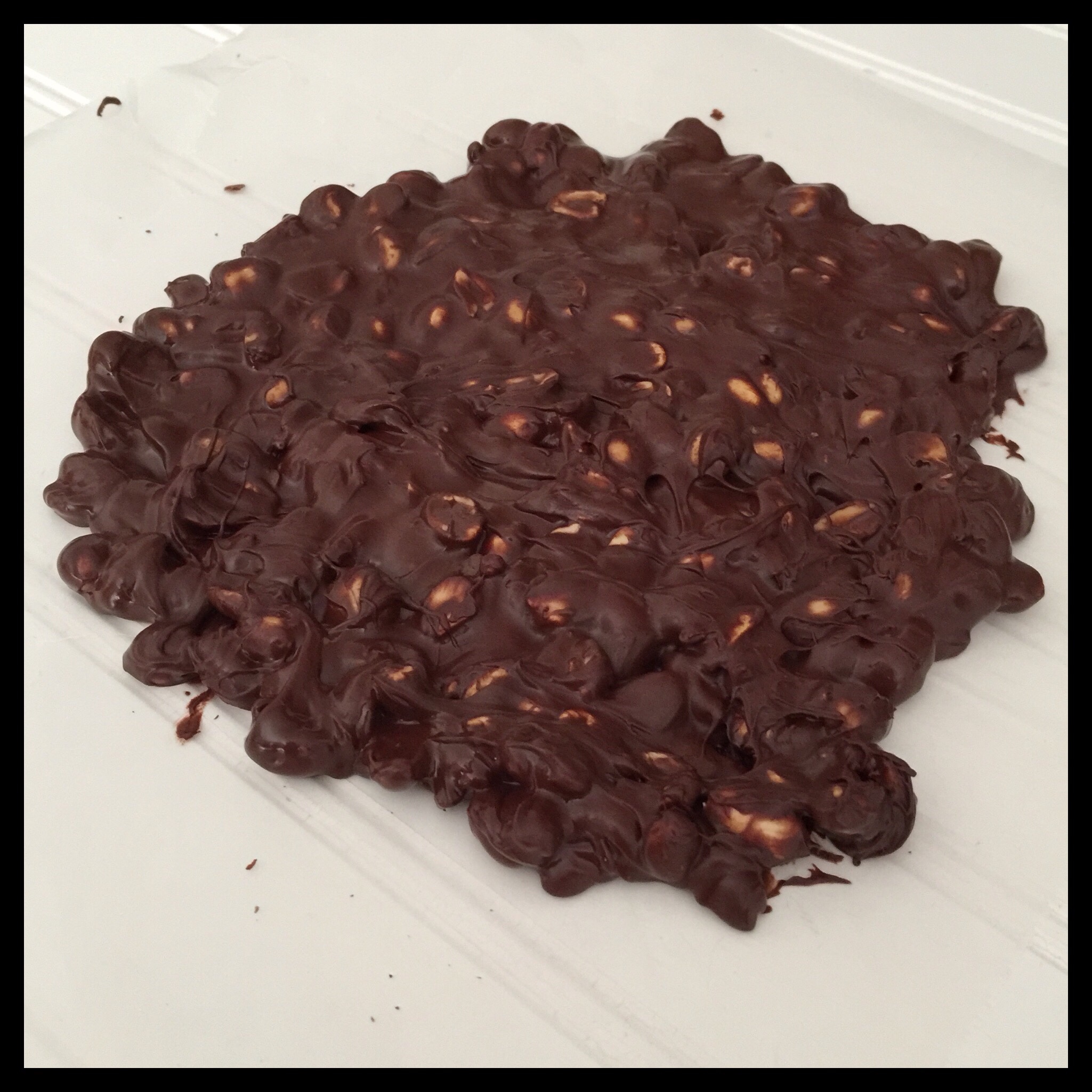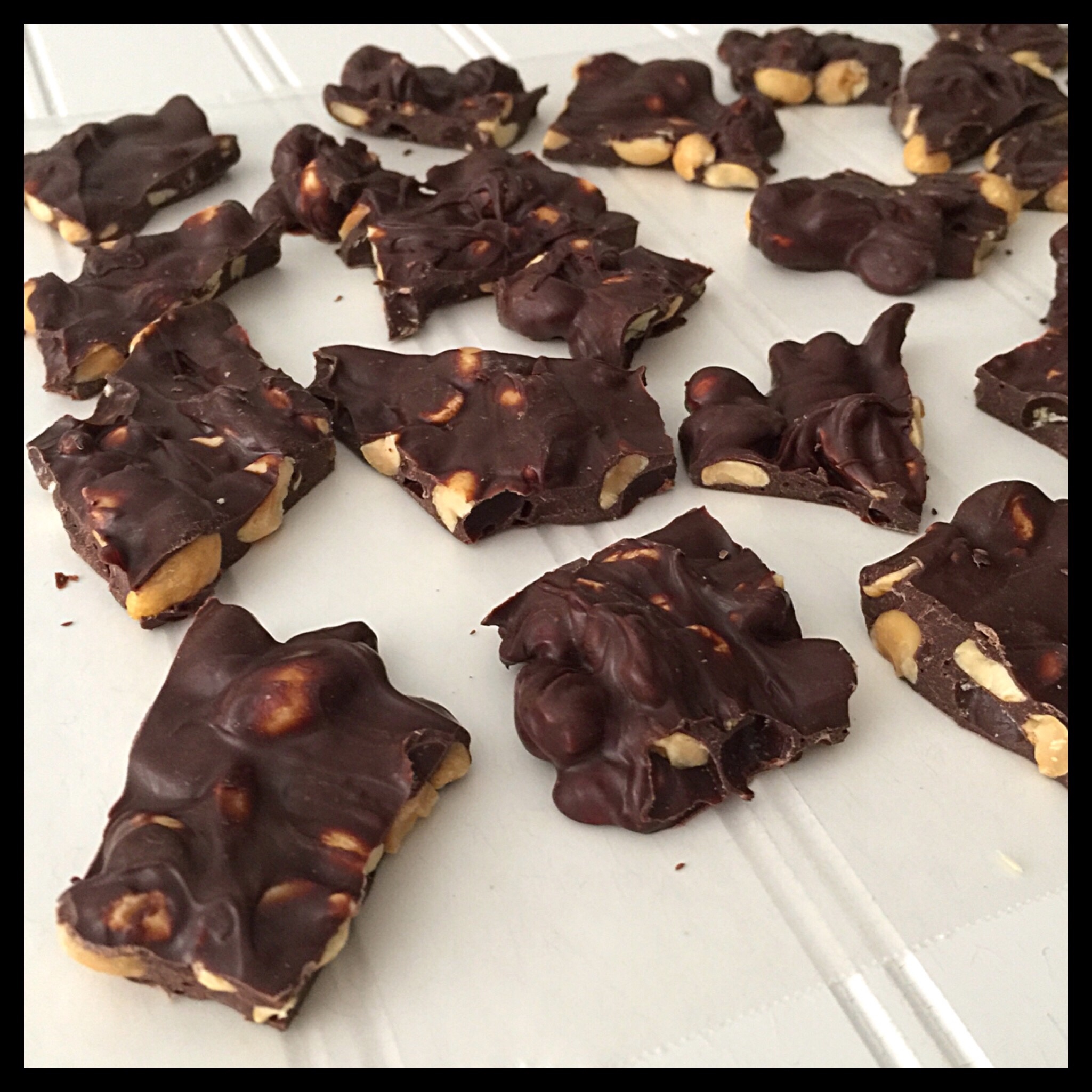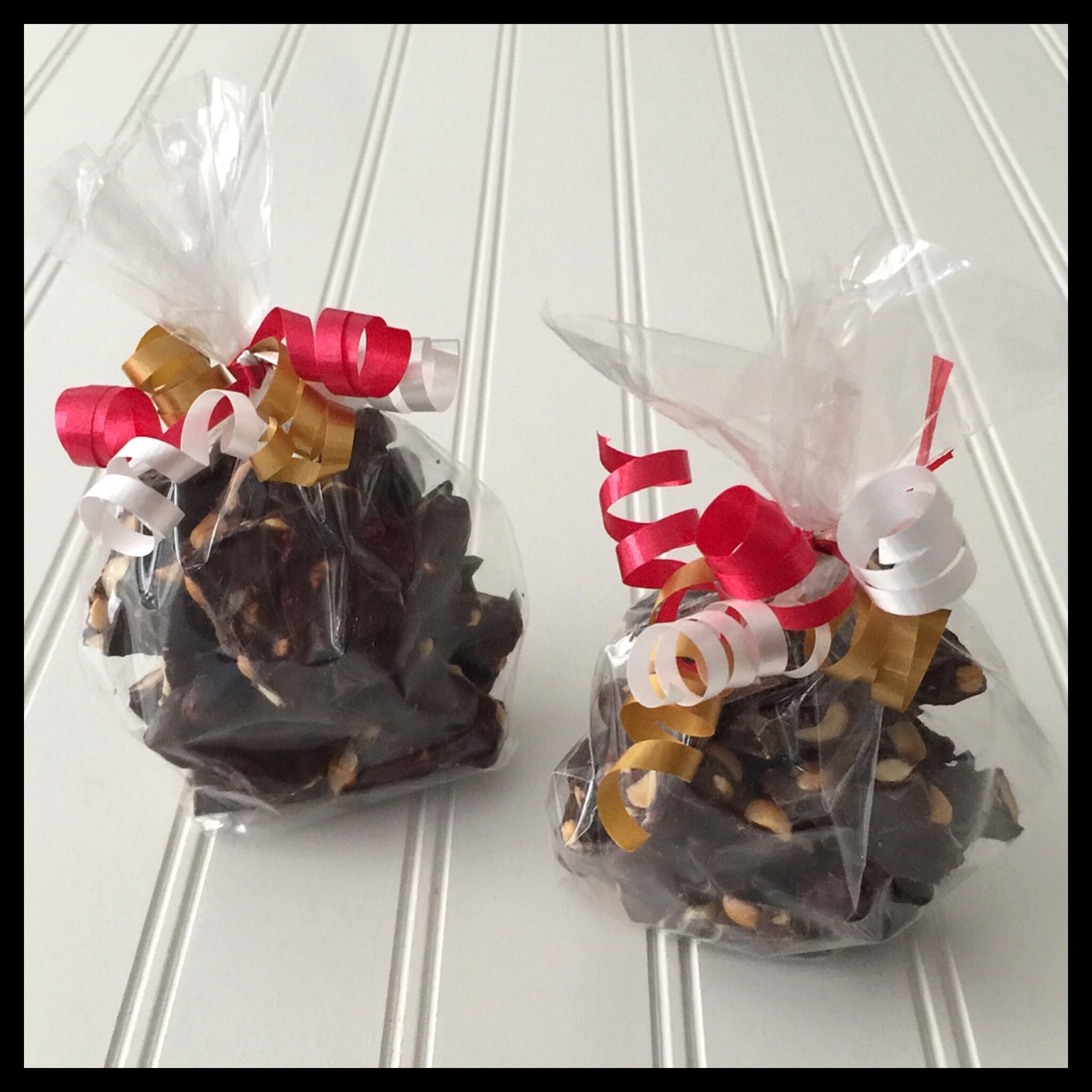 You can dip as many more fondant-covered cherries from the second half as you can, but your chocolate will eventually be too shallow to dip any more. Add some chopped nuts and or dried fruit to the remaining chocolate and spread it out on waxed paper to make chocolate bark. Allow it to harden fully, then break the bark into pieces. I used chopped peanuts and got two treat bags full of bark.