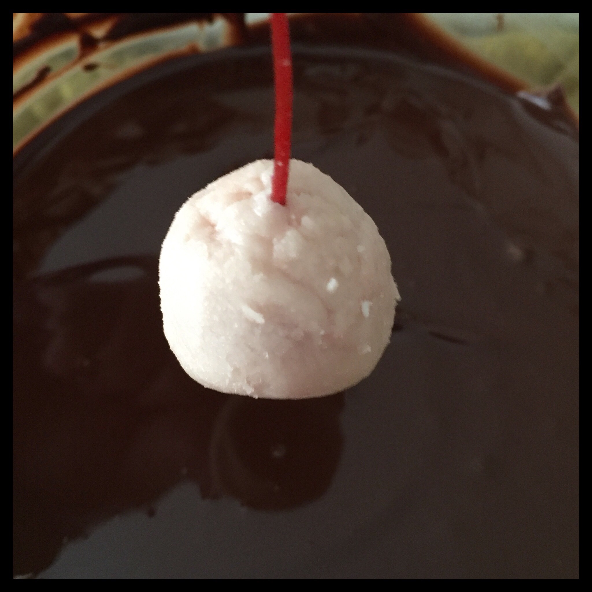 To dip cherries with stems, gently pick up a cherry by the stem and dip fully in the chocolate: