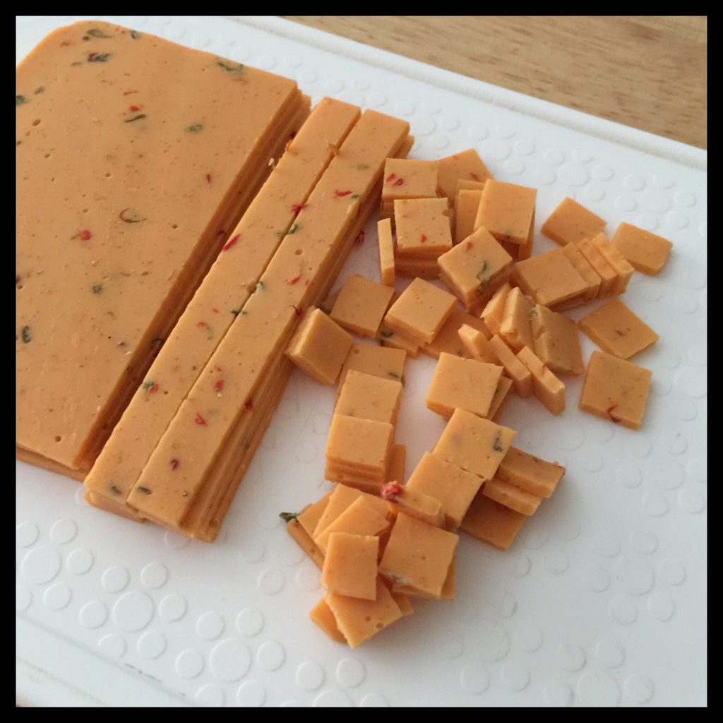 I cut the slices into 1/4″ squares and it worked perfectly in the cornbread. (I have also used Follow Your Heart pepper jack with good results.)