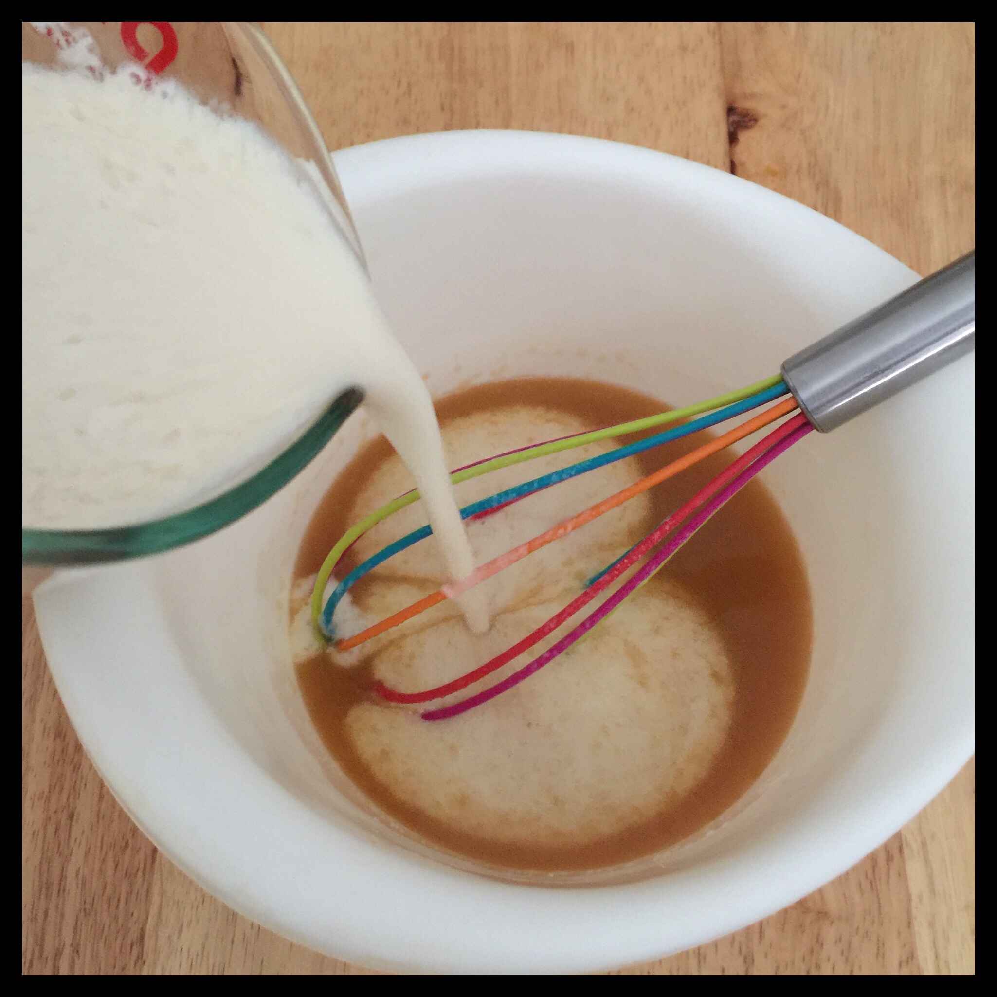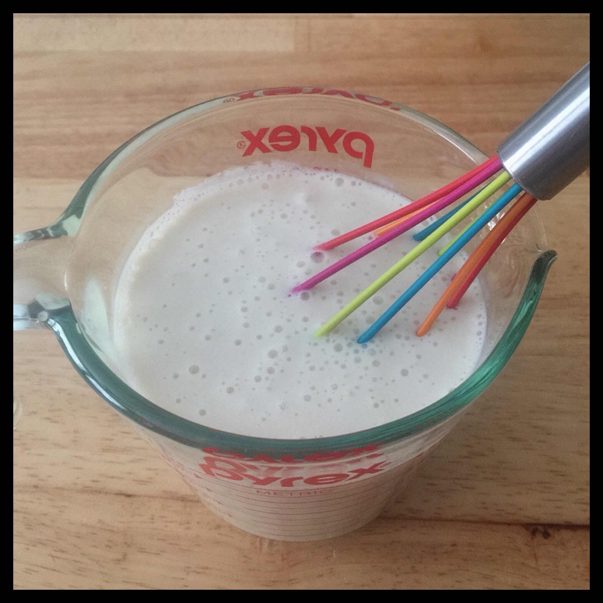 Add the vinegar to the plant milk (I use Silk Original Soymilk) and whisk them together: