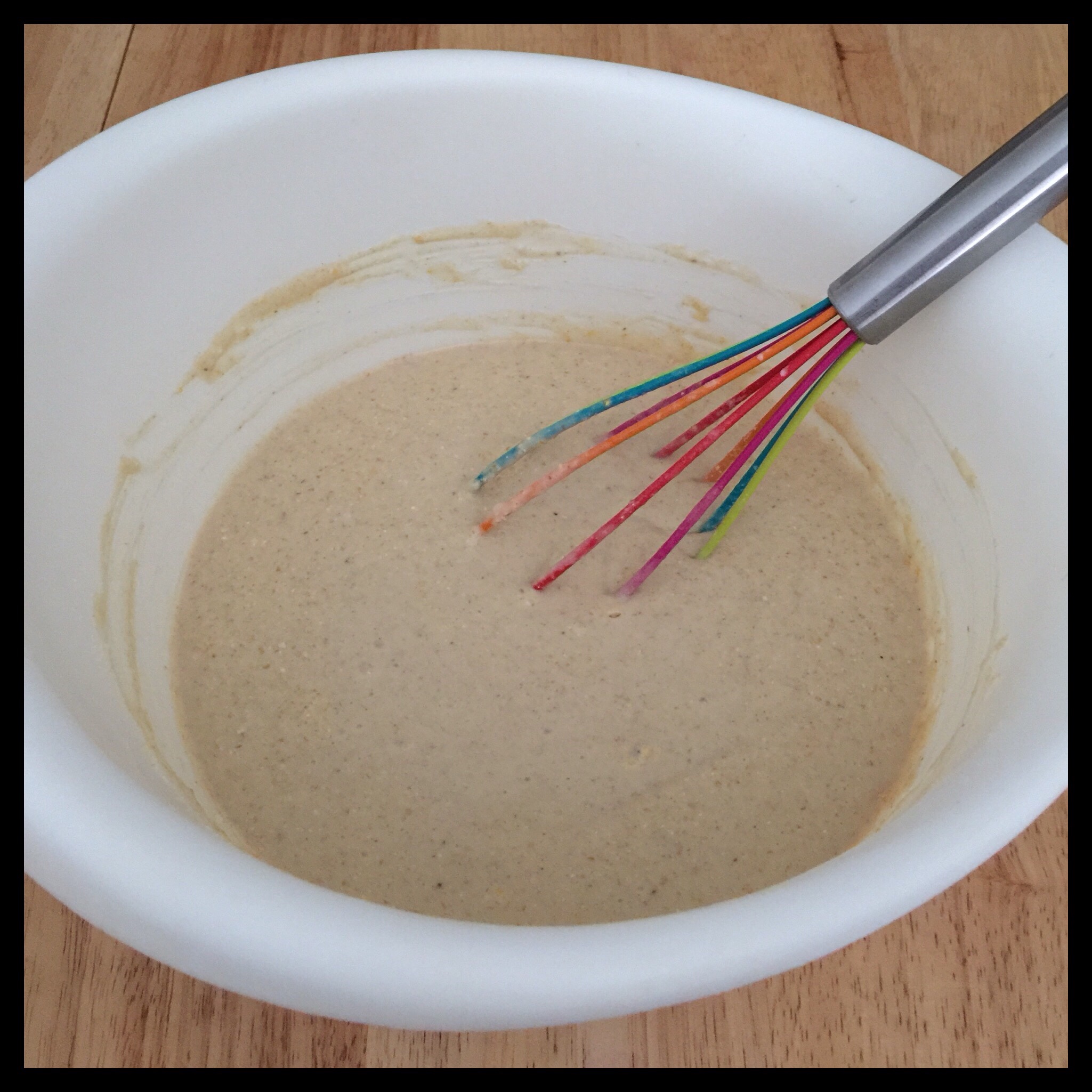 Add the flour, cornmeal, baking powder, soda, and salt to a medium-sized mixing bowl. You will also add The Plant Based Egg now if you are using wheat flour. (See the recipe notes for wheat flour directions.) Add the optional sugar now too if you want sweeter cornbread. (Note that the color of your cornbread will be darker if you use a flour blend that contains oat flour. The cornbread and the muffins with blueberries shown here were made with blend three, and the rest of the muffins shown below were made with other blends that do not have oat flour.)