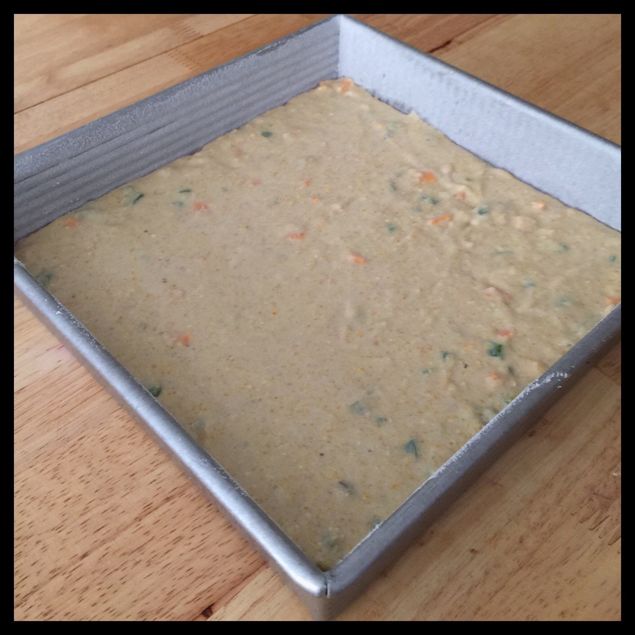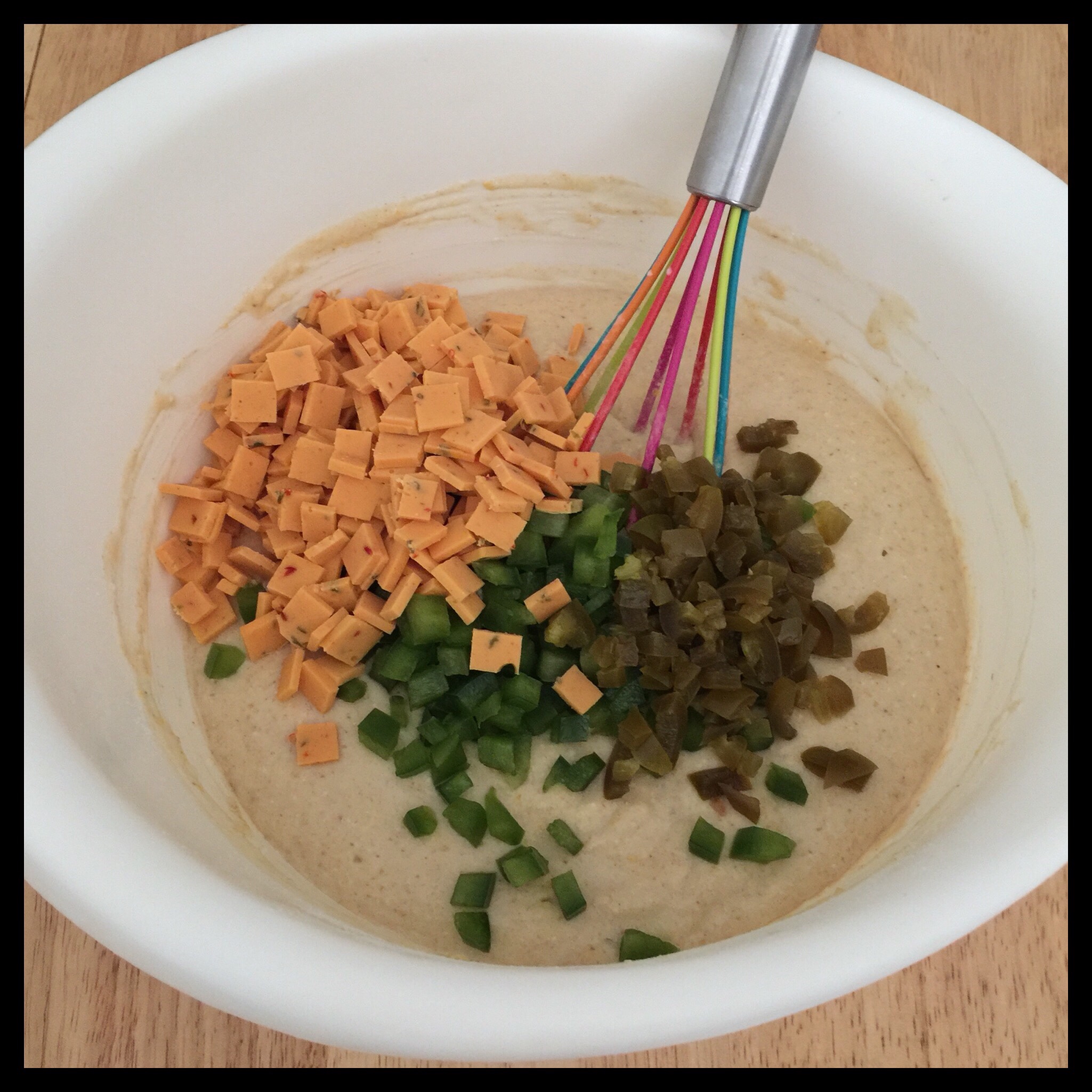 Add any mix-ins, then stir the batter down. Stir the batter even if you are not adding mix-ins. Note: I use 30 g (1/4 c) of chopped pickled jalapenos with the seeds removed when I use a spicy vegan cheese and I double the jalapenos if I am using a plain cheese. You can adjust the spiciness to your taste!
