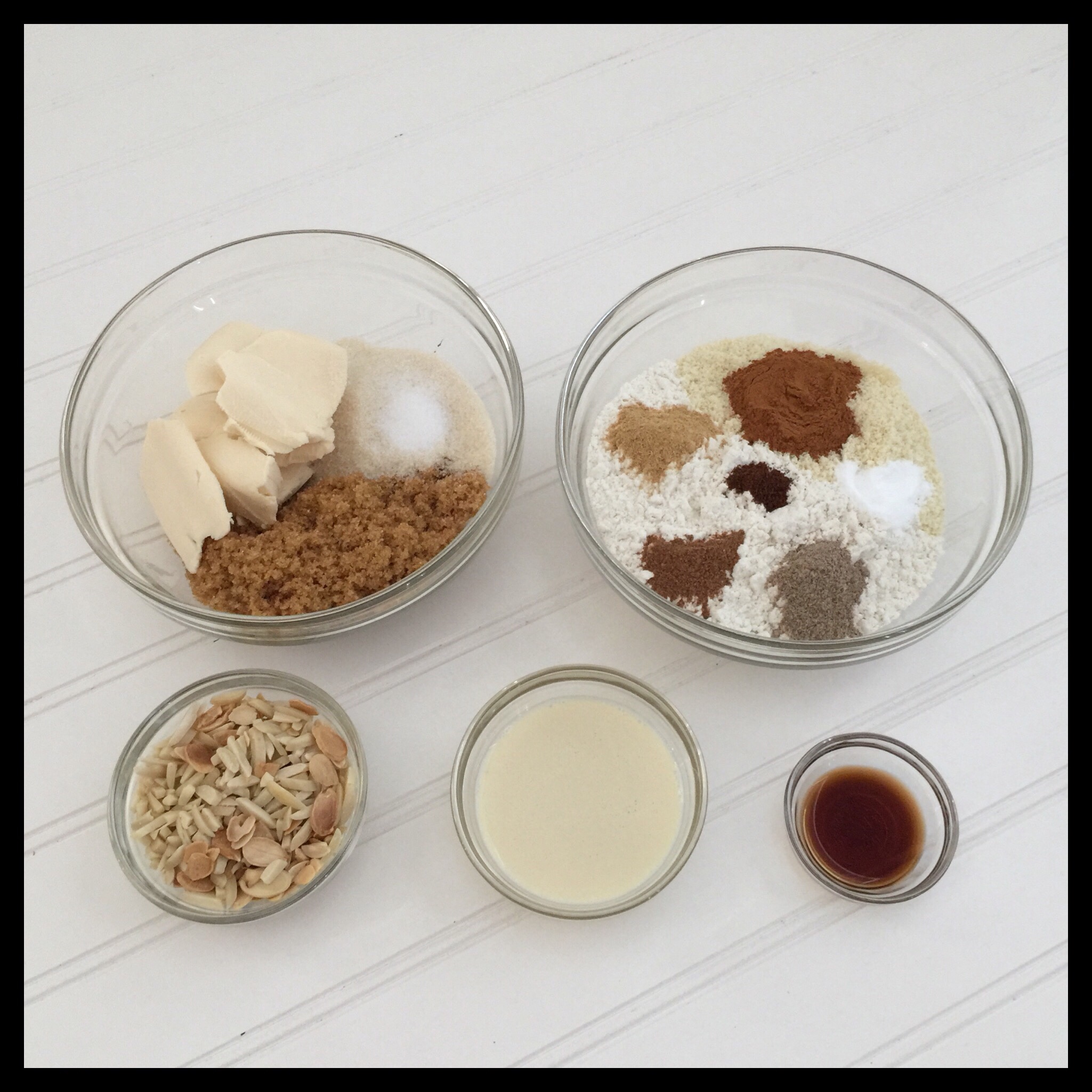 These spiced Dutch cookies are light, crispy, and perfect for the holidays! I made them for St. Nicholas Day, but they would also be great for Yule or Christmas. The spices get stronger as the dough sits, so make the dough a day or two before baking the cookies if you have time to wait. Here are the ingredients you will need to make them:
