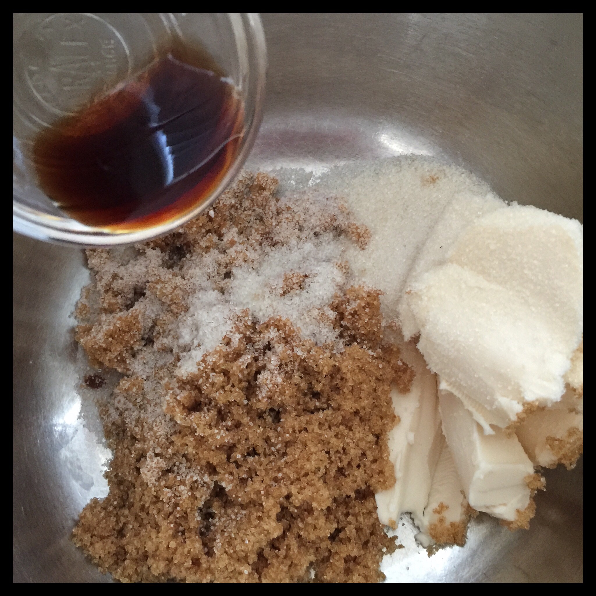 Add the sugar (I use Zulka brand), vegan brown sugar (I make my own), vegan butter (I use Earth Balance), salt, and vanilla to a mixing bowl:
