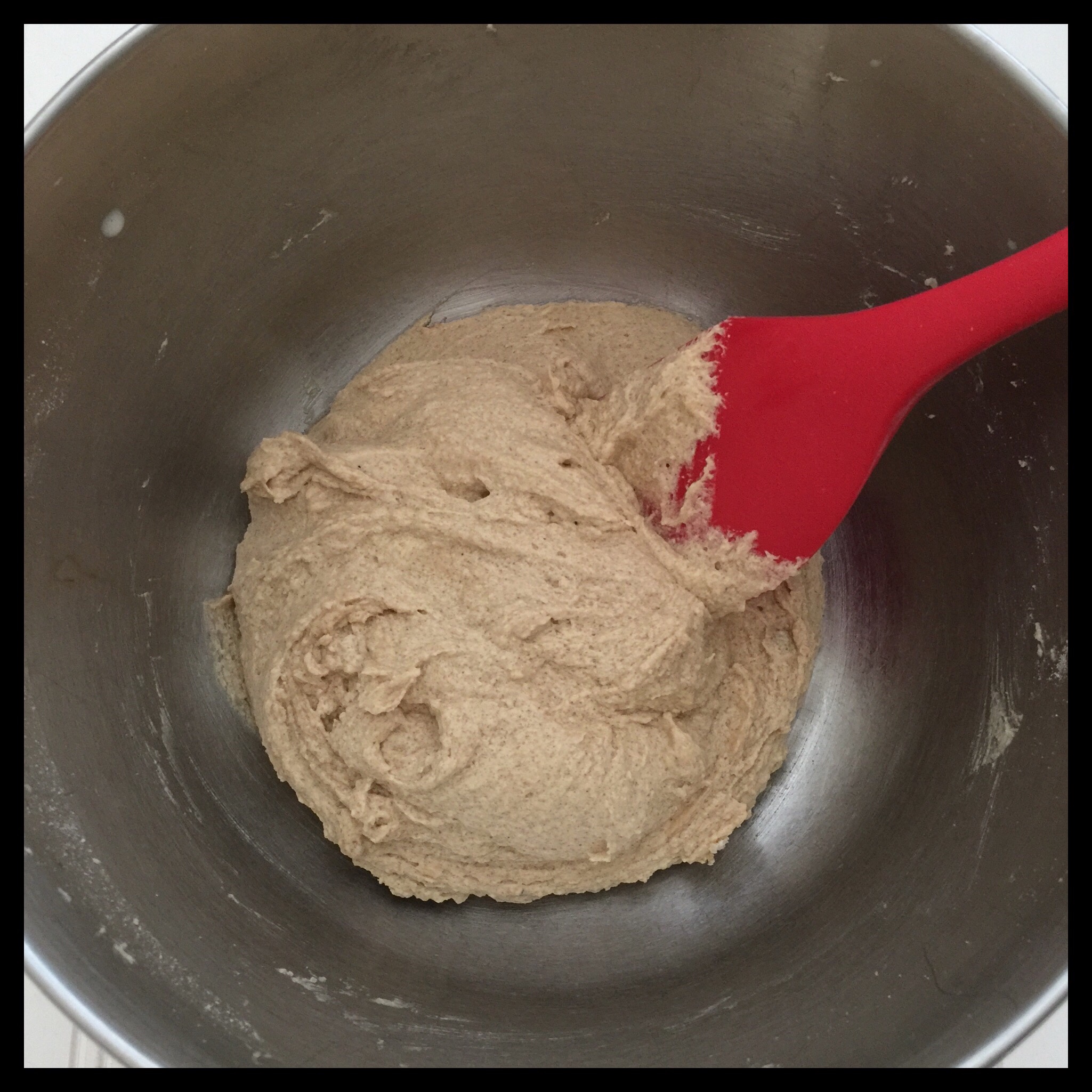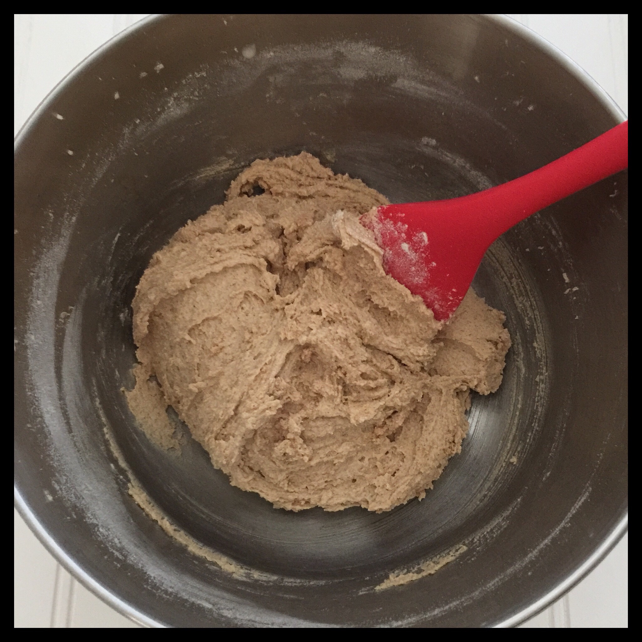 Scrape down the beaters and the bowl. Add half of the remaining flour mixture and stir it in with the spatula. Add the rest of the flour mixture and stir again. Your dough should be fairy stiff, but not at all dry. You should be able to shape it easily without it cracking, but it should be stiff enough to not stick to the bowl or your hands.