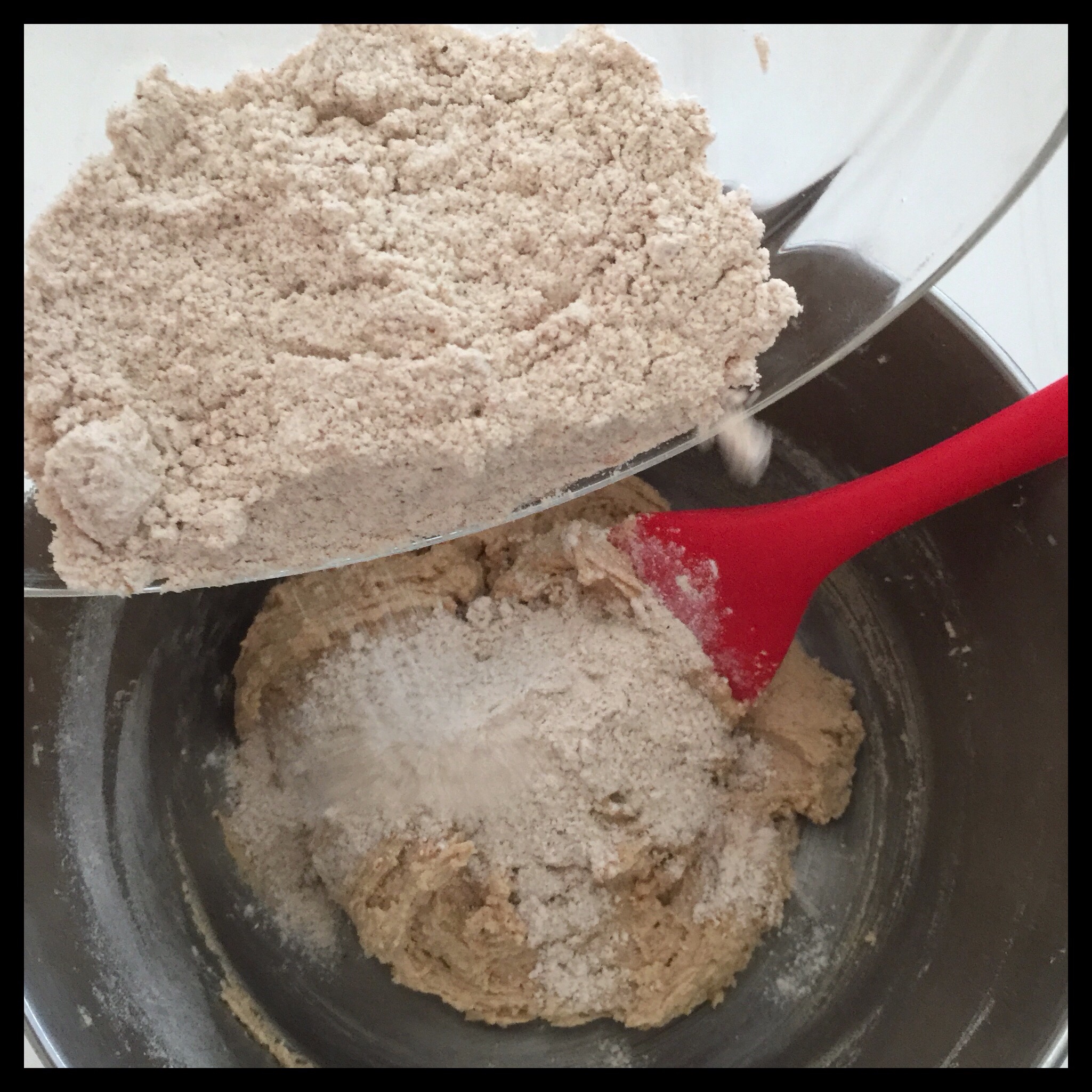 Add half of the remaining flour mixture and stir it in with the spatula: