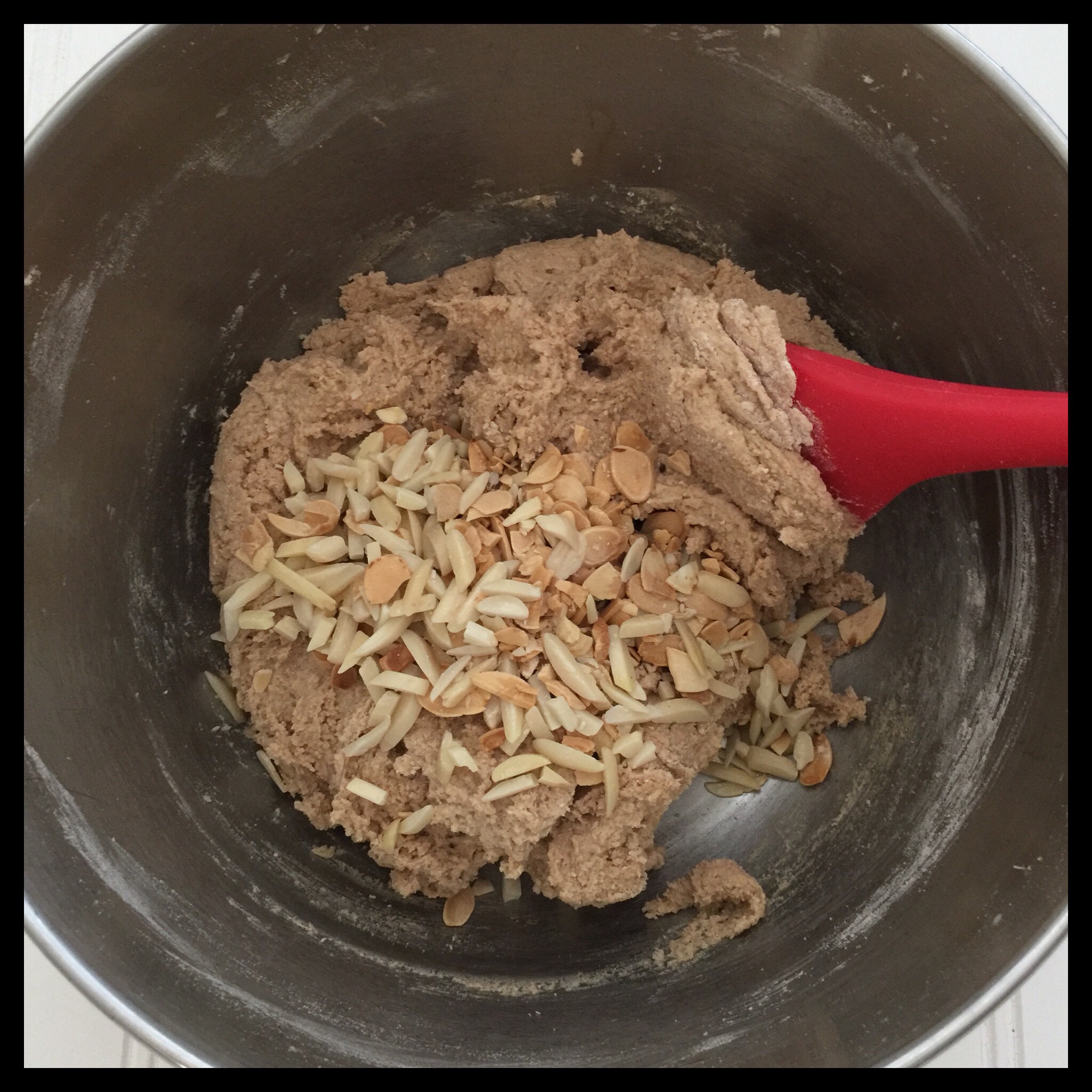 Stir in the almonds. I used half almond slivers and half toasted sliced almonds. Either is fine to use. If you are toasting your almonds, spread them out on a baking sheet and toast for five minutes at 350 degrees Fahrenheit. Let them cool before adding them to your cookie dough.