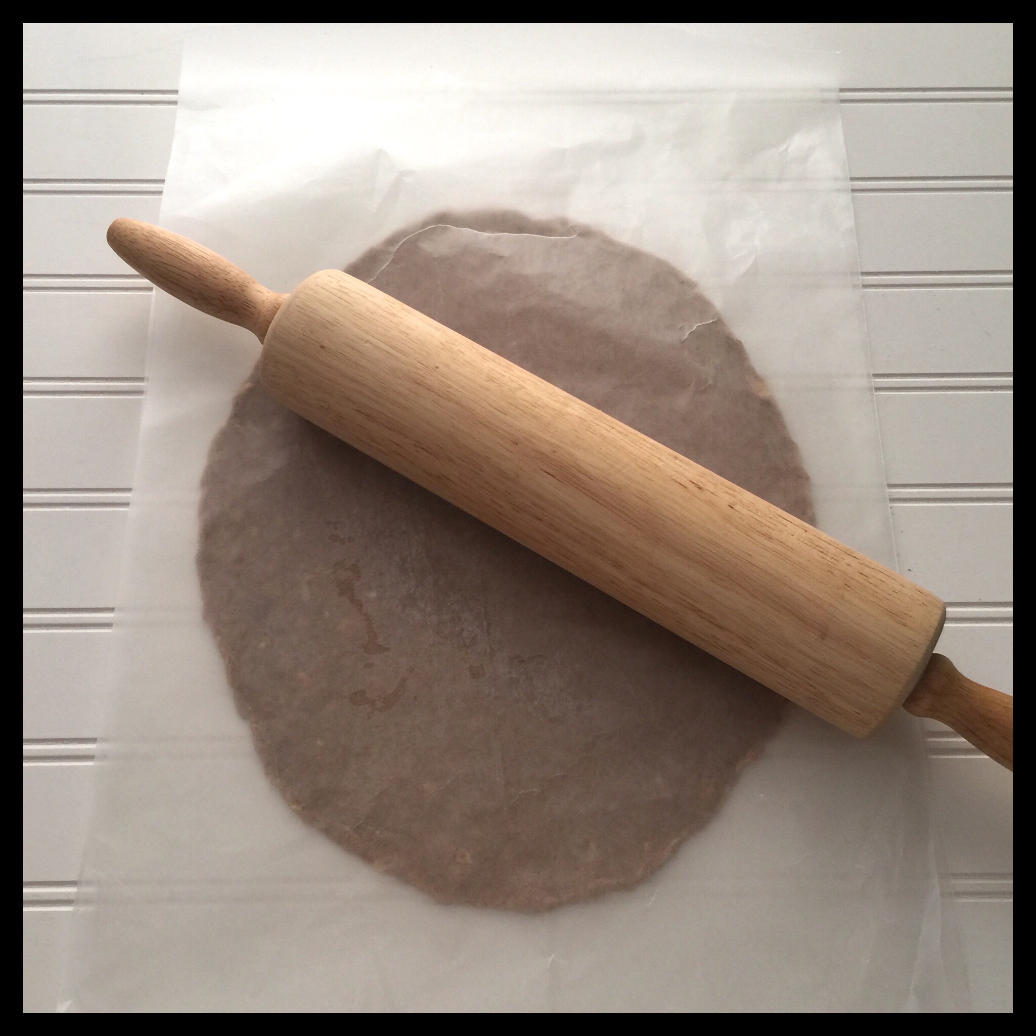 Roll out one disk of chilled dough out between two pieces of waxed paper. You want it to be a little more than 1/8″ thick: