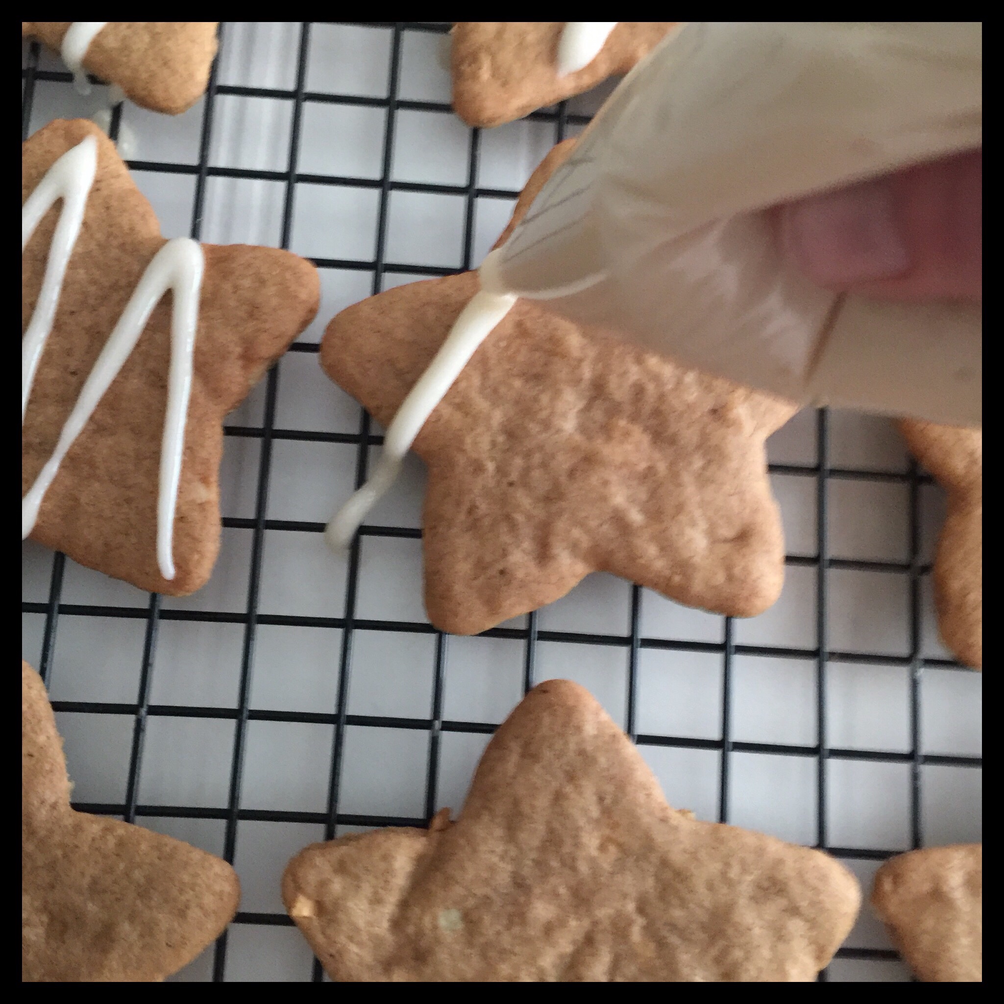Add the icing to a sandwich baggie, squeeze out the air, and zip the top closed. Cut a bit off one corner of the bag, and pipe a zigzag pattern on the star cookies: